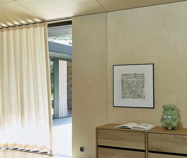 Bløde stofgardiner balancerer æstetik og funktionalitet i et rum, hvor kreativitet og ro får lov til at smelte sammen.