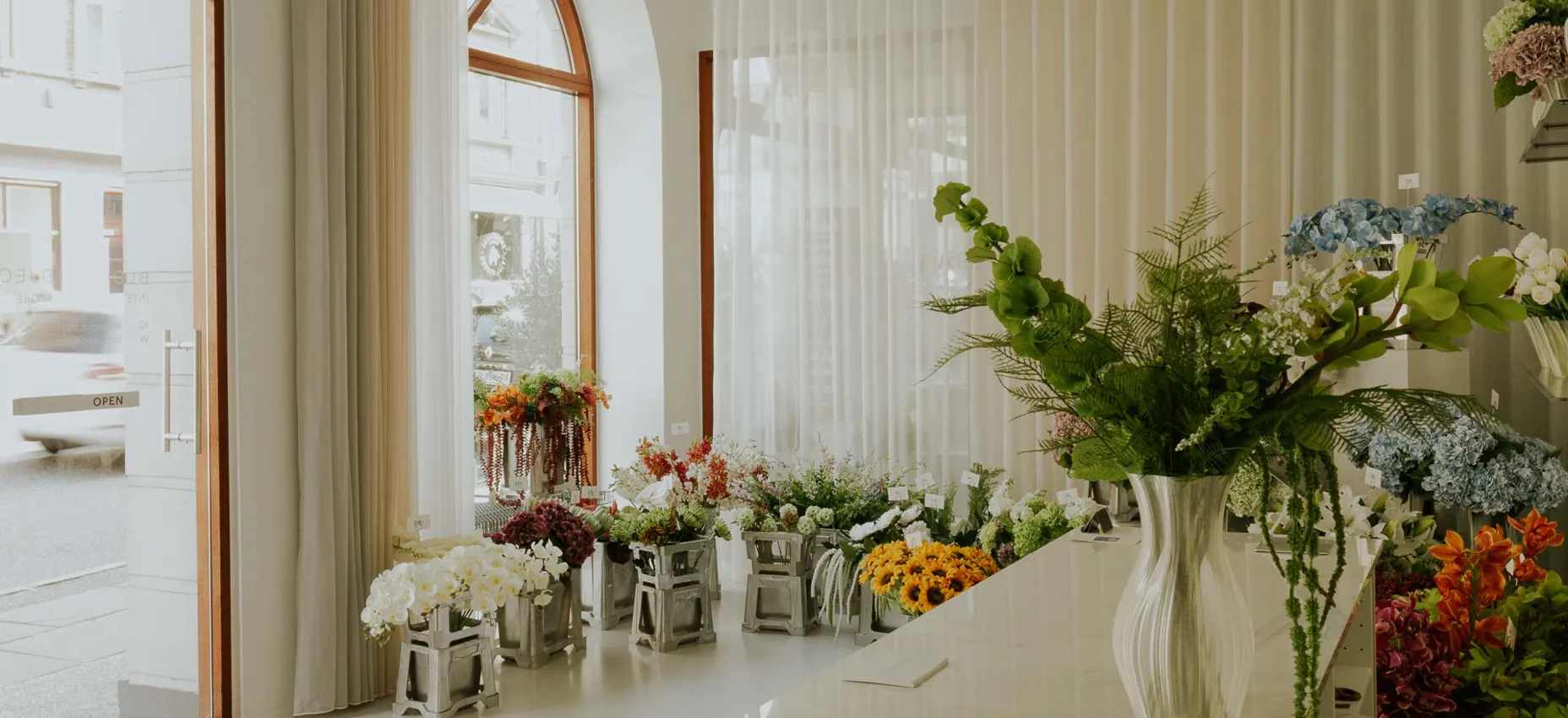 Når man træder indenfor i BLOOM OBJECTS, åbner der sig et lyst og indbydende univers med højt til loftet. Lyset trænger ind gennem lange, bløde stofgardiner i grønlige, beige og hvide nuancer. Reolerne i højglanshvidt skaber en minimalistisk ramme, mens gardinerne tilfører varme og en diskret elegance.