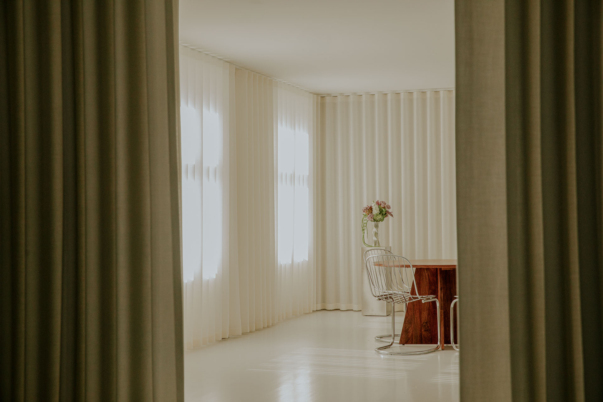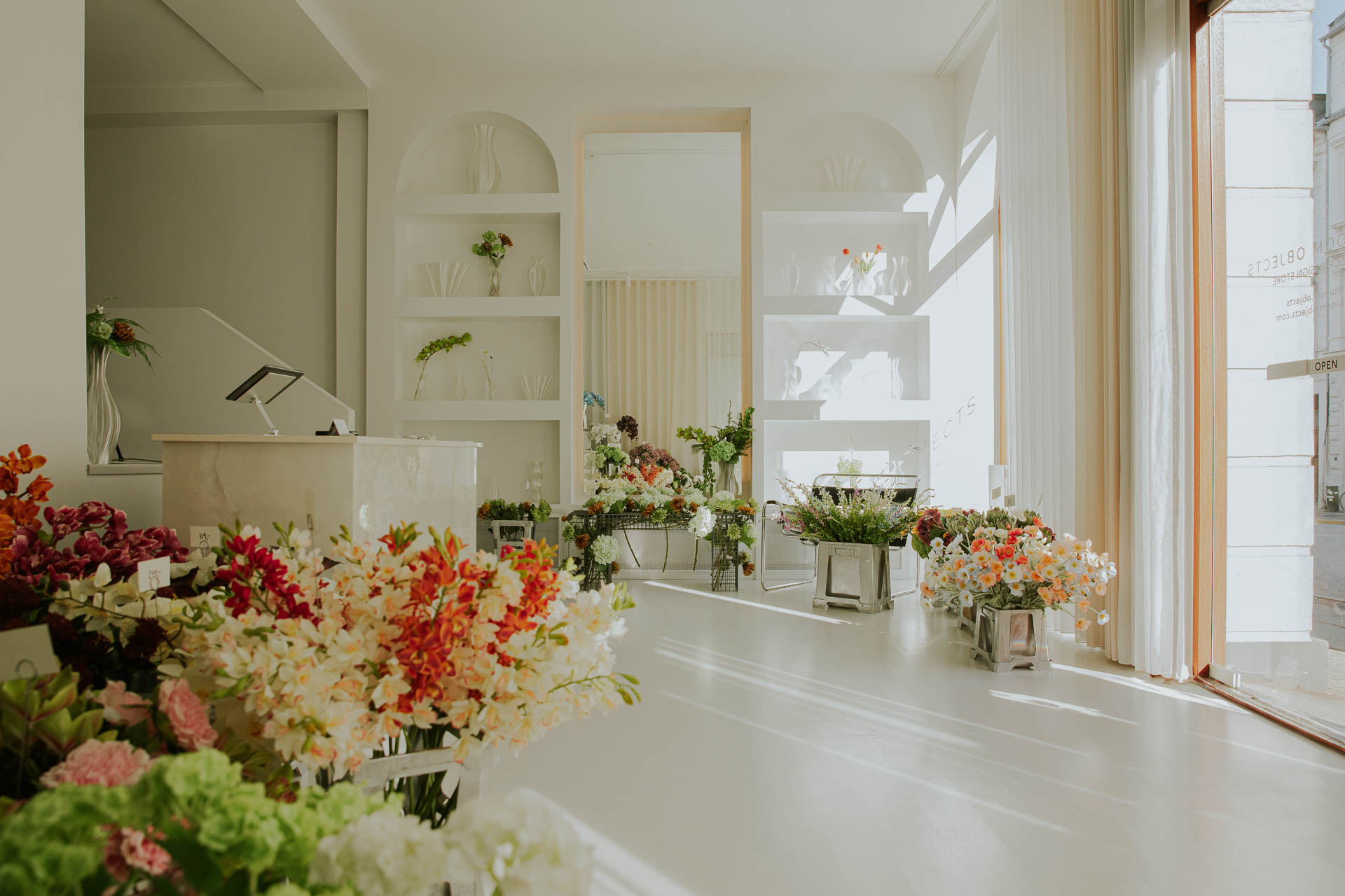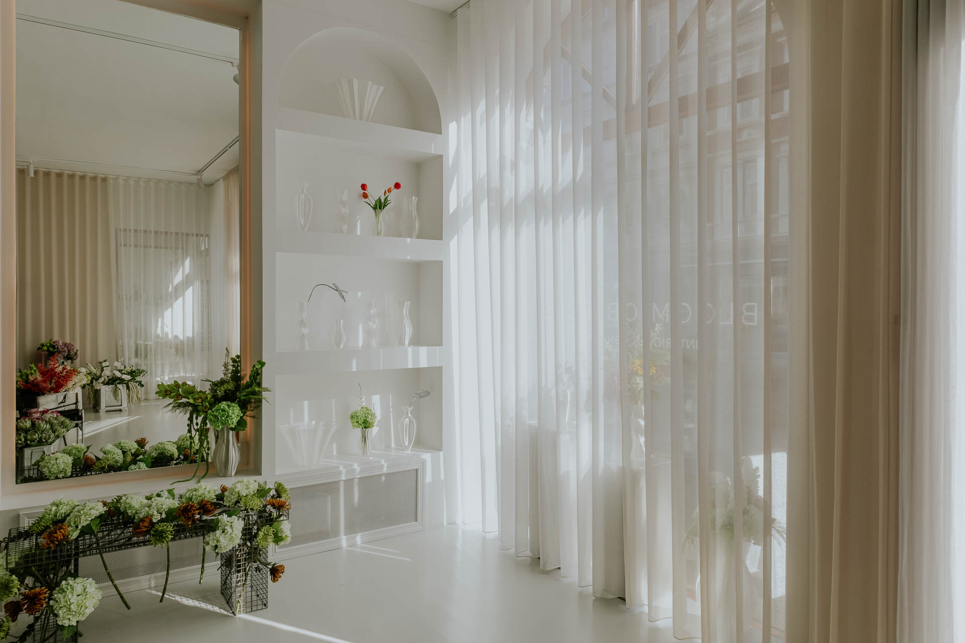Når man træder indenfor i BLOOM OBJECTS, åbner der sig et lyst og indbydende univers med højt til loftet. Lyset trænger ind gennem lange, bløde stofgardiner i grønlige, beige og hvide nuancer. Reolerne i højglanshvidt skaber en minimalistisk ramme, mens gardinerne tilfører varme og en diskret elegance.