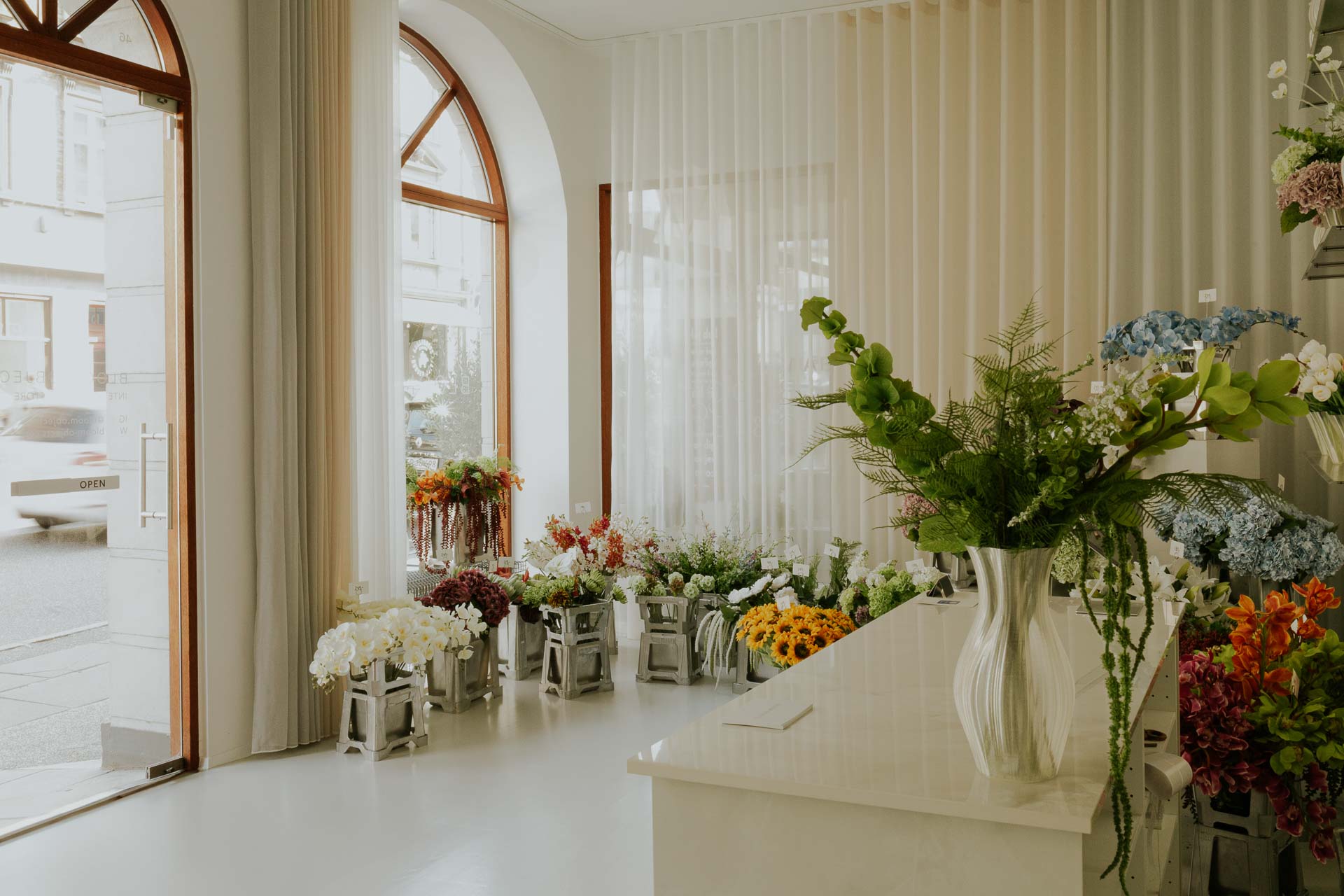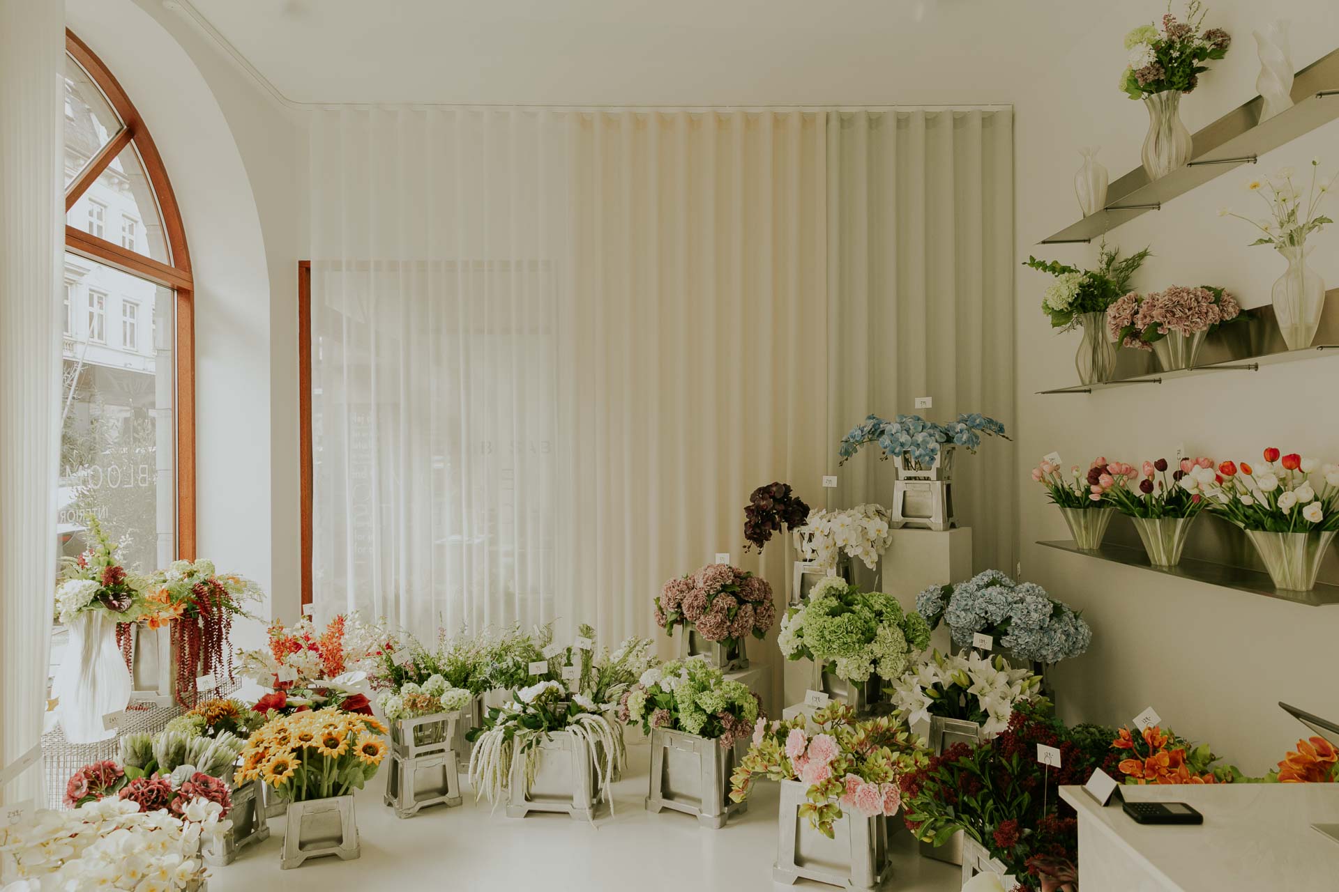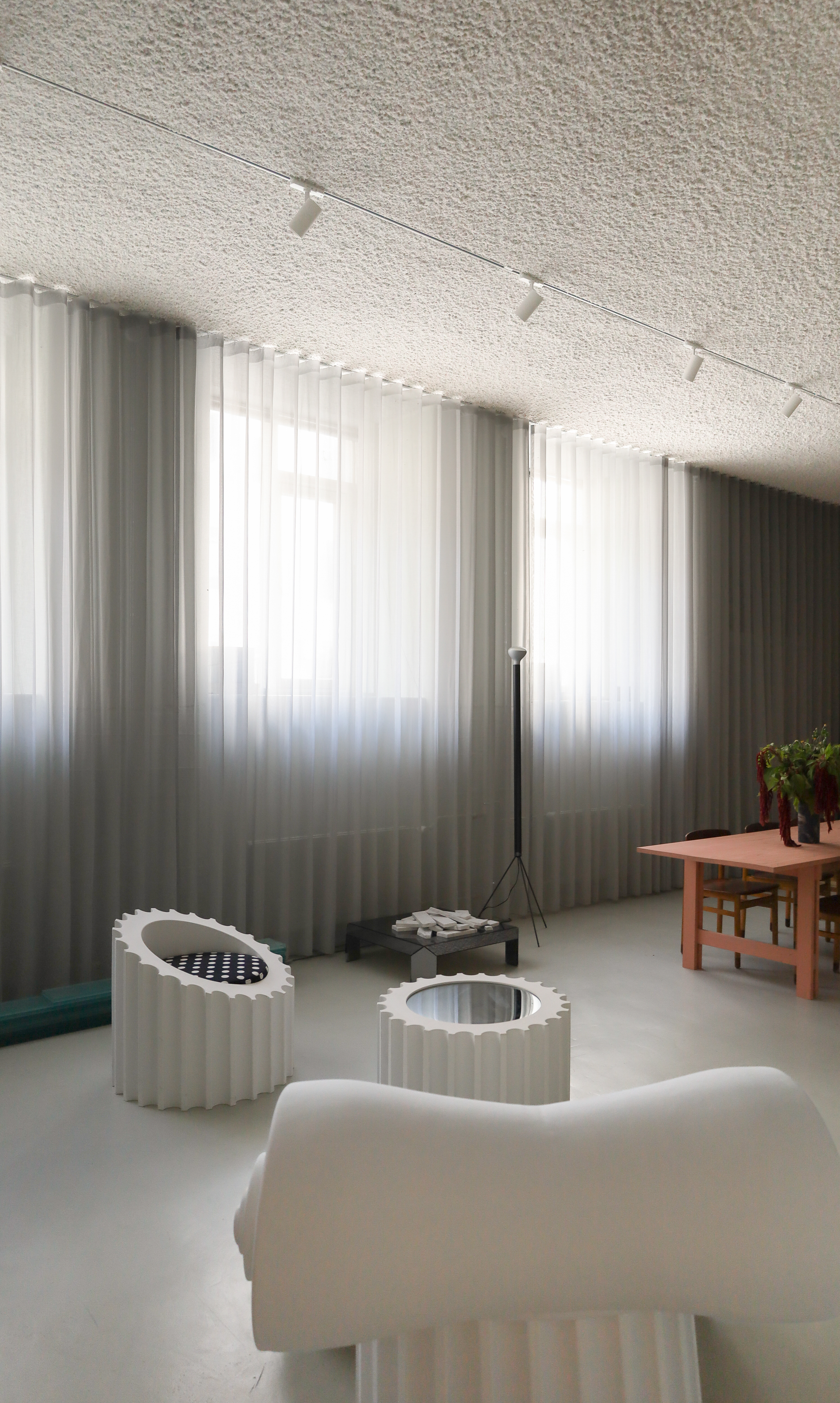 Når man træder indenfor i BLOOM OBJECTS, åbner der sig et lyst og indbydende univers med højt til loftet. Lyset trænger ind gennem lange, bløde stofgardiner i grønlige, beige og hvide nuancer. Reolerne i højglanshvidt skaber en minimalistisk ramme, mens gardinerne tilfører varme og en diskret elegance.