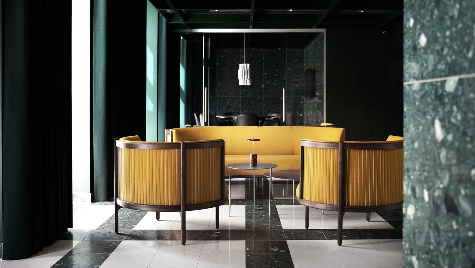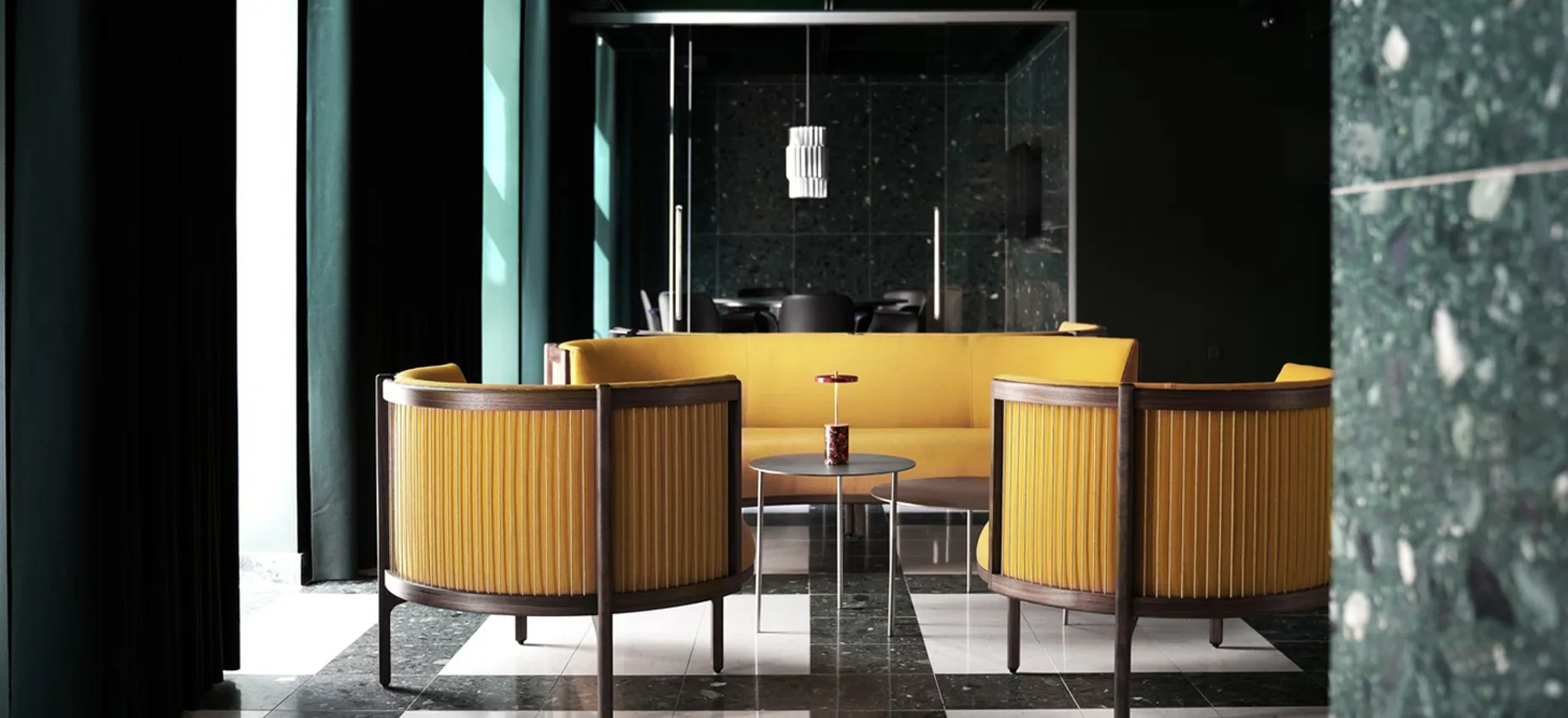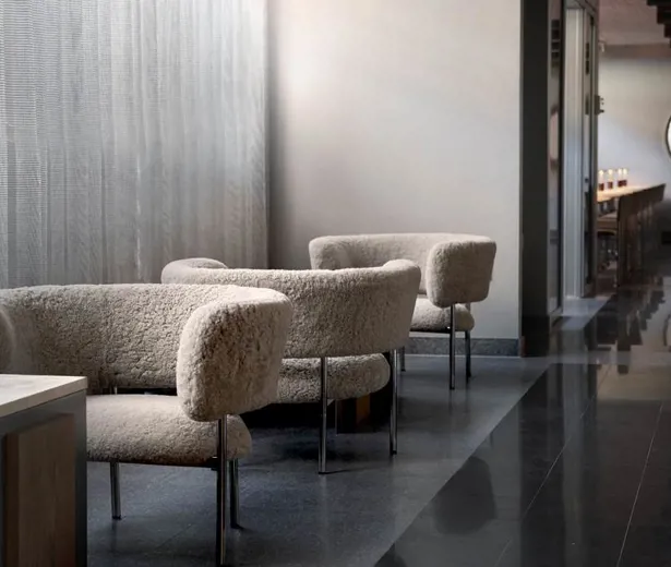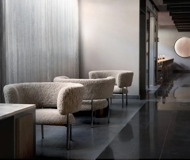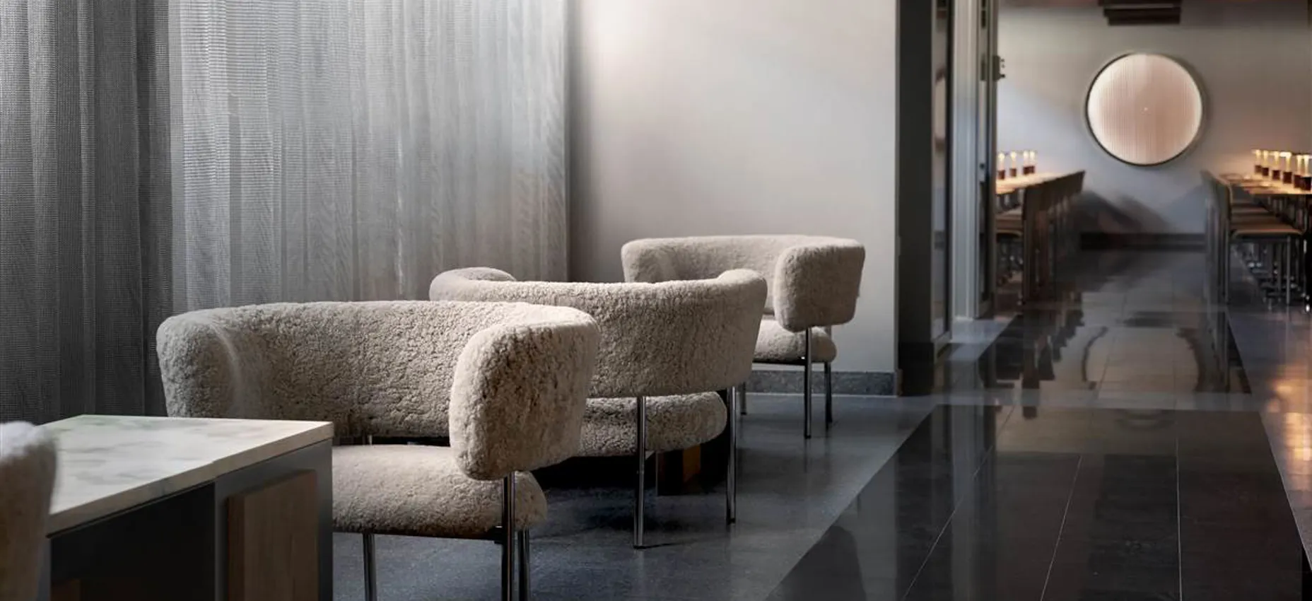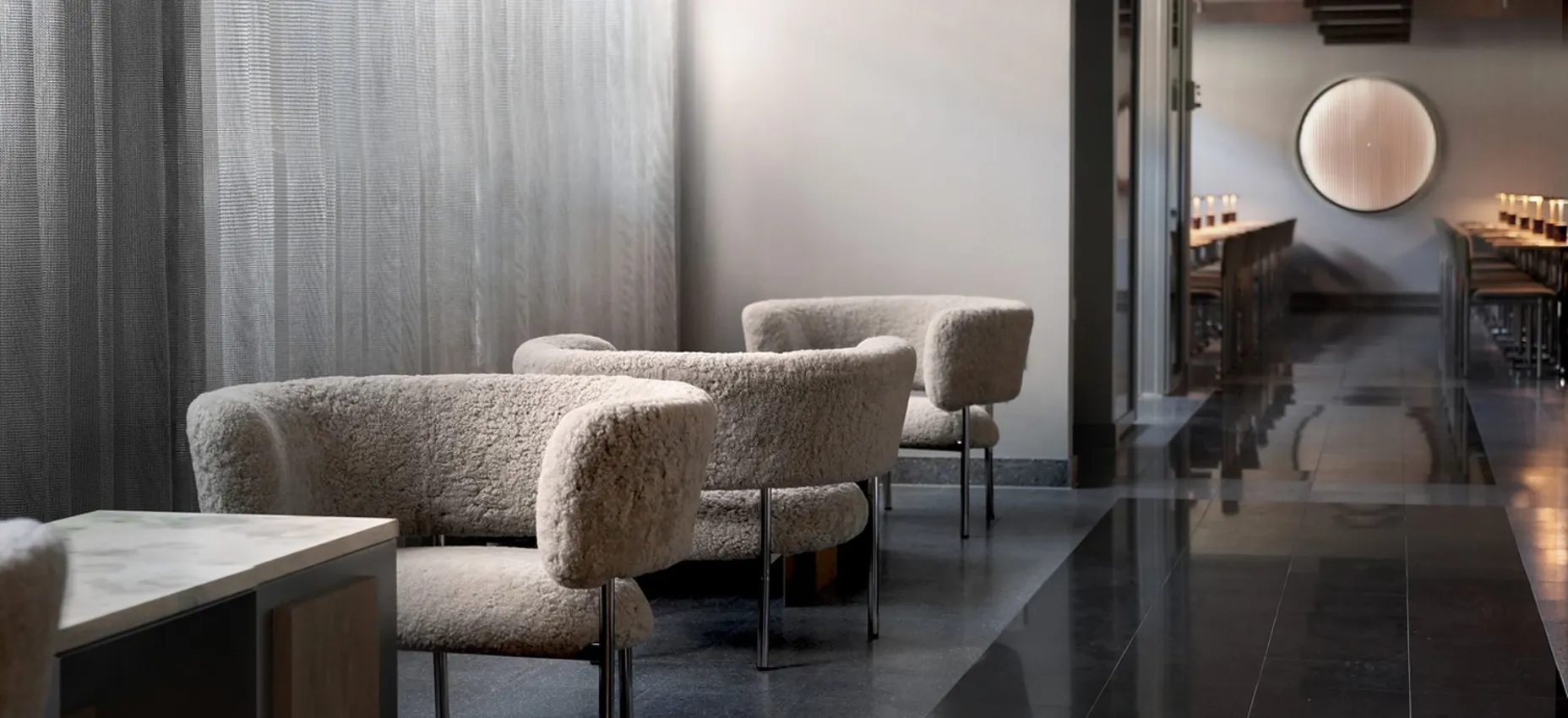 “De to designverdener skulle mødes i alle former for materialitet. Mod Frederiksberg arbejdede vi med tunge, grønne uldgardiner med markant drapering. Mod Nørrebro et mere metallisk, blødt tekstil, der skærmer mod gaden. I dialogen med Fischer fandt vi de kvaliteter, der kunne balancere funktion og udtryk.“