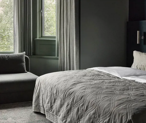 På værelserne samler farverne de to fortællinger. Loft og gavlvæg står i den mørke Frederiksberg-grønne tone, mens de øvrige vægge er malet i salviegrønne nuancer. Gardinerne følger den salviegrønne skala og er udviklet i samme farveunivers som tæpperne. Dette skaber et samlet og roligt udtryk, hvor tekstiler og overflader hænger sammen. Farverne står i kontrast, men deler samme tonalitet. Som Poul Høilund beskriver det, skaber det ro i rummet.