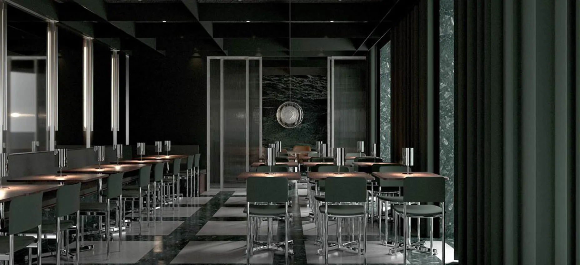 Stueetagen rummer to lobbyer og to restauranter. Mod nord ligger Nørrebro, som er den tætte og rå bydel. Her arbejder indretningen med grå toner og et mere urbant udtryk. I lobby og restaurant filtrerer et gråt, let metallisk netdessin lyset mod gaden. Gardinet skærmer og bevarer samtidig forbindelsen til byrummet.