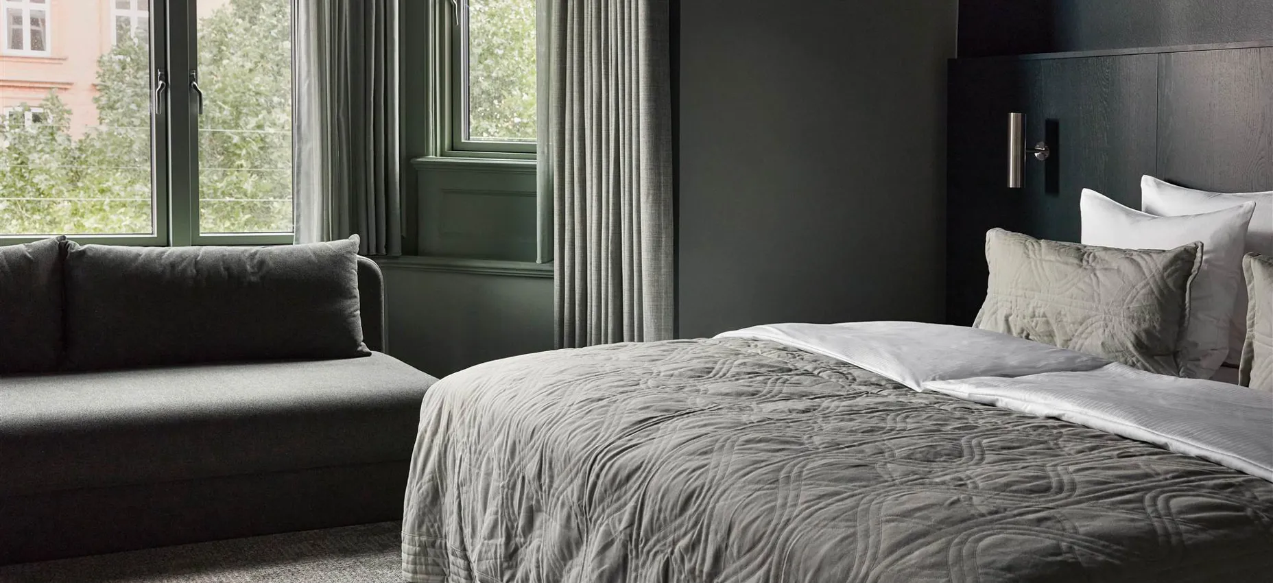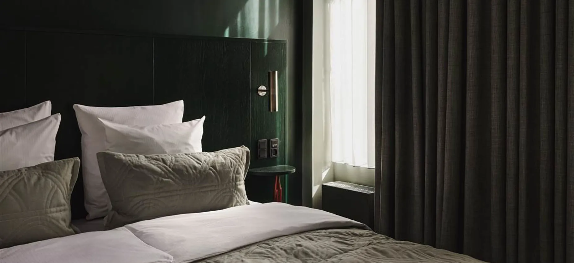 Mod syd træder Frederiksberg frem i en mørk, klassisk grøn tone. I lobby og restaurant hænger tunge, specialindfarvede ulddessiner i 100% portugisisk uld. Her arbejdede Poul Højlund bevidst med “meget tunge Frederiksberg-grønne uldgardiner med tyk drapering”, netop for at tilføre rummet en oplevelse af tyngde og eksklusivitet.
