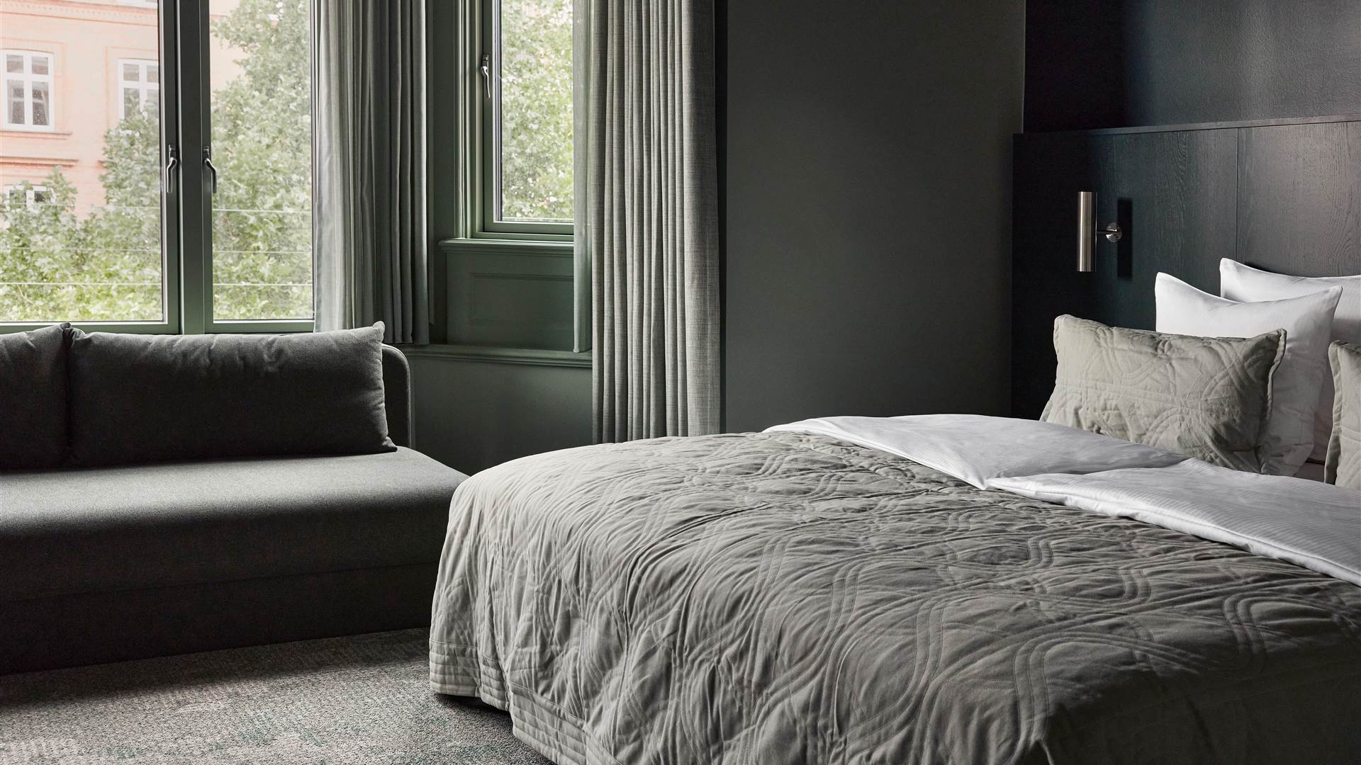 På værelserne samler farverne de to fortællinger. Loft og gavlvæg står i den mørke Frederiksberg-grønne tone, mens de øvrige vægge er malet i salviegrønne nuancer. Gardinerne følger den salviegrønne skala og er udviklet i samme farveunivers som tæpperne. Dette skaber et samlet og roligt udtryk, hvor tekstiler og overflader hænger sammen. Farverne står i kontrast, men deler samme tonalitet. Som Poul Høilund beskriver det, skaber det ro i rummet.