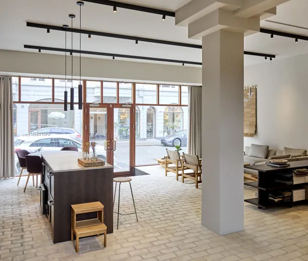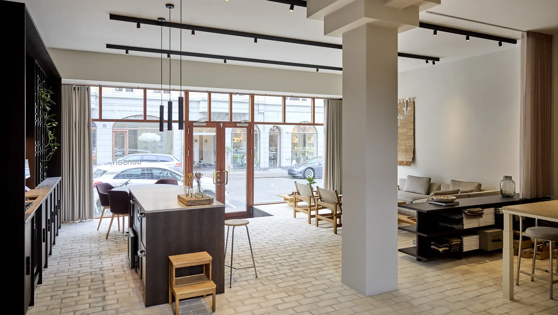 I vinduespartierne er der valgt et mere robust gardin, som filtrerer lyset og danner et roligt modspil til de lettere, transparente tekstiler i showroomet. Gardinerne fungerer både som stemningsskabere og som et diskret bagtæppe, der giver plads til møblerne, uden at rummet mister karakter.