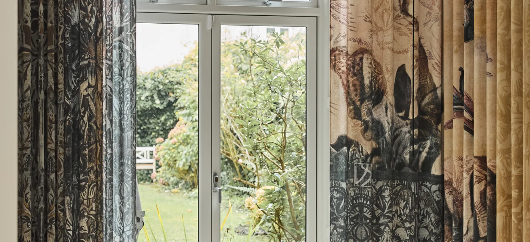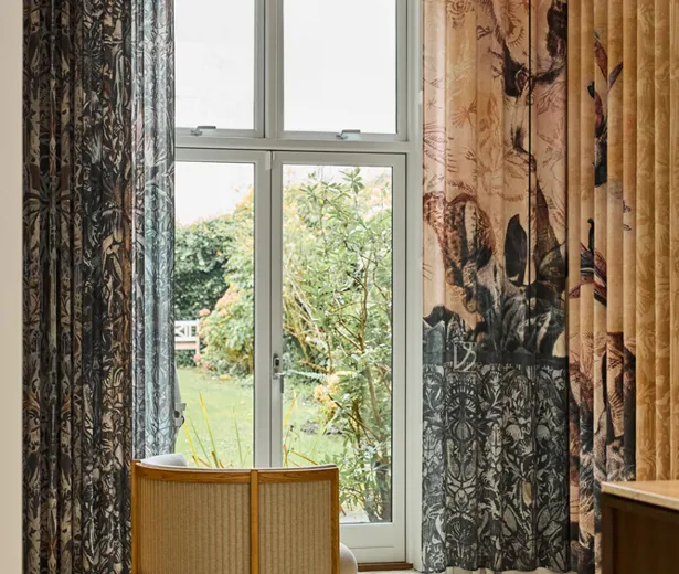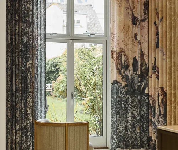 Ud mod baggården hænger et blomstermønstret gardin fra Vang & Steensgaard. De håndtegnede og blækmalede collagemotiver tilfører rummet et mere karakterfuldt udtryk.