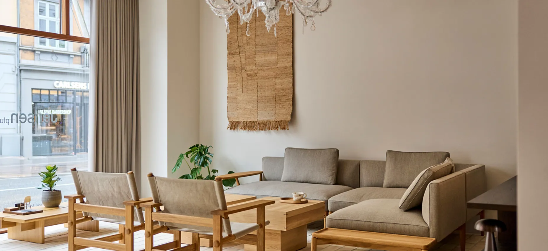 For at skabe kontinuitet tog Didde Højlund udgangspunkt i rummets faste elementer: lyset, gulvet og polstringerne. Gardinerne blev her et bærende arkitektonisk greb: “Vi har arbejdet med en rolig og jordnær farvepalette, der kan blive hængende over tid, også selvom det løse inventar udskiftes i takt med nye trends,“ fortæller Didde Højlund.