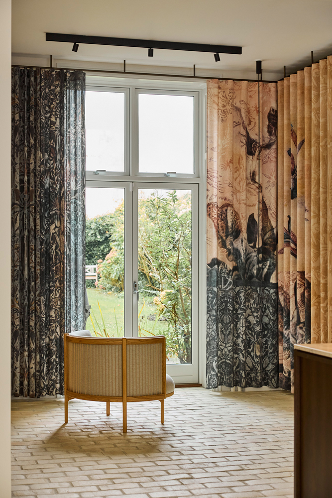 Med en varm og let rå bund er der arbejdet med flere tekstile kvaliteter, blandt andet semitransparente gardiner fra Kurage og et mere grafisk tekstil fra Kvadrat. Sammen skaber gardinerne en afdæmpet variation, der tilfører rummet dybde uden at dominere.