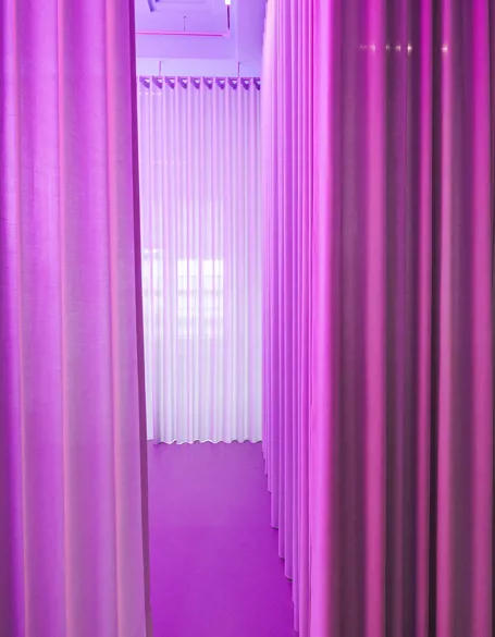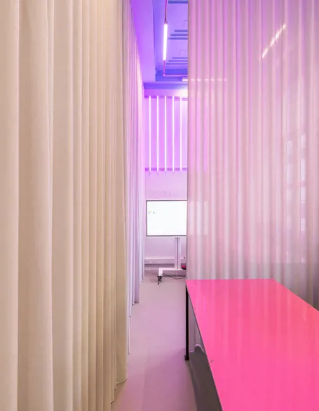 Oprindeligt havde man tænkt, at de store tekstilflader skulle udgøre et farveunivers. Men med lysstofrør som lamper, ændrede beslutningen sig, forklarer Pernille: “Gardinernes voluminøse størrelser kaldte på rolige, neutrale nuancer. Stoffet tager farve alt efter lampernes belysning, så de enkelte rum får deres eget karaktertræk. Hvor det hvide lys skaber en rolig stemning, sætter de mere farverige rum gang i kreativiteten.”