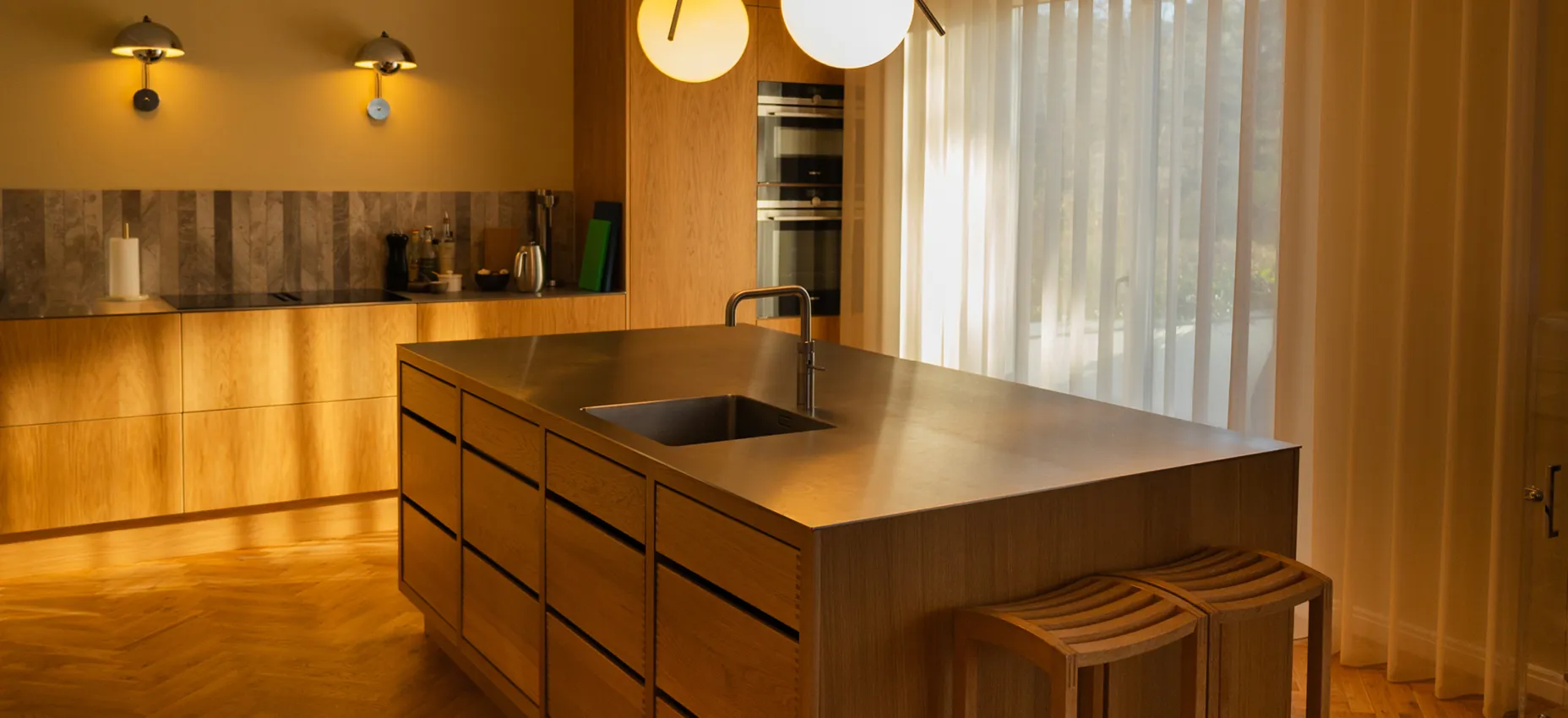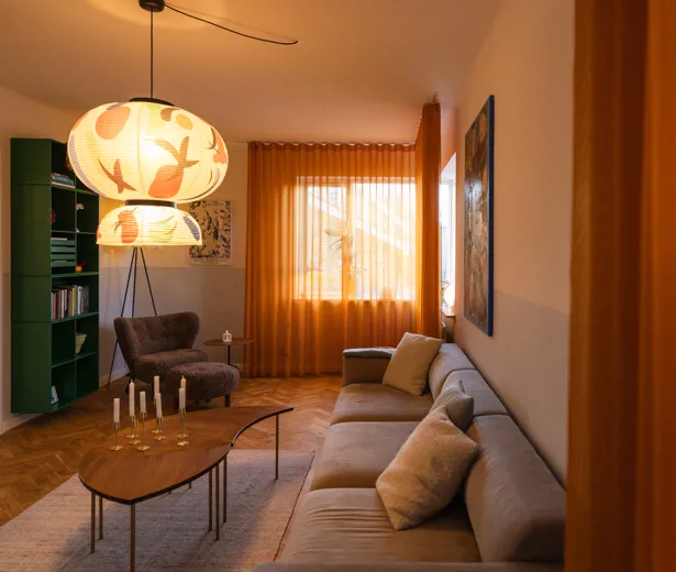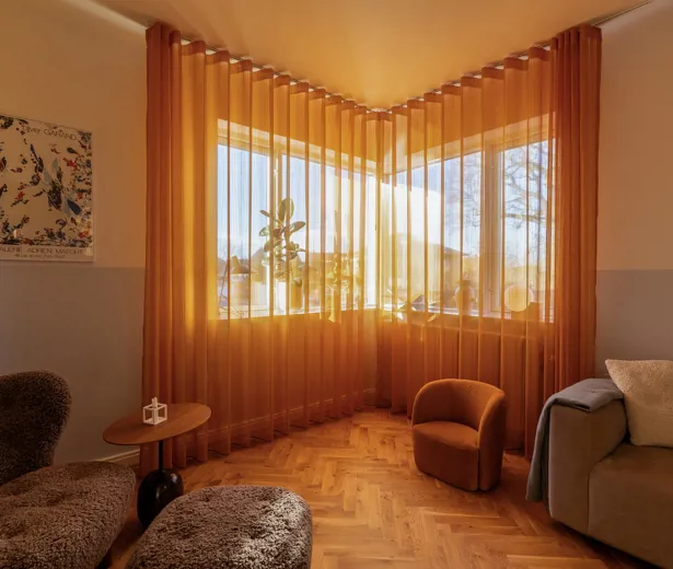 Gardiner kan både lukke lyset ind og fungere som det samlende element i en bolig. Hjemme hos stylist Emma Kousgaard Johannessen er stilen præget af klassiske danske designmøbler, tidløse lamper og bløde tekstiler. Gardinerne er semitransparente og valgt i farvetoner, der harmonerer med hvert rums nøje udvalgte interiør. Når solen skinner, opstår der levende skygge- og lysmønstre, der elegant danser hen over materialerne.