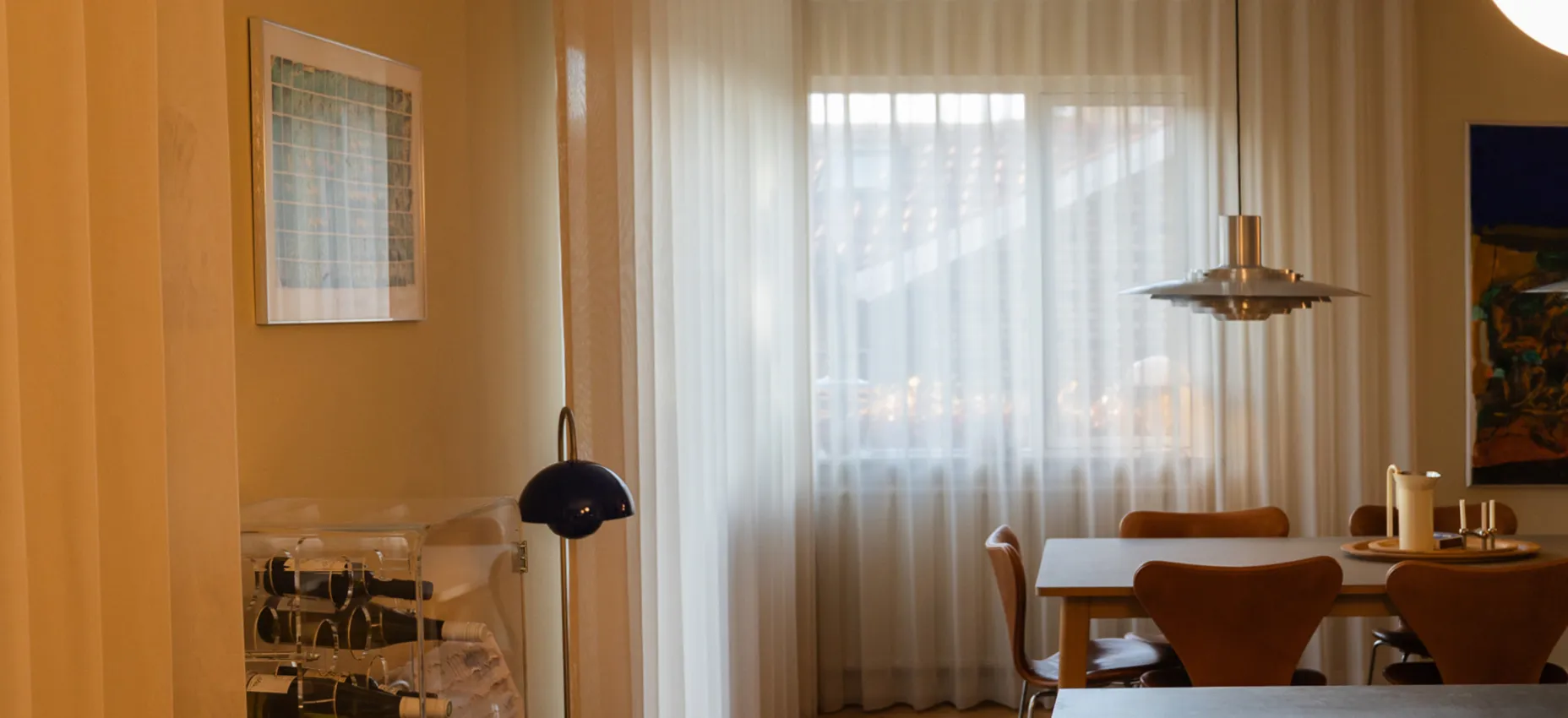 Boligstylist Emma Kousgaard Johannessen bor med klassiske designmøbler, lamper og tekstiler. Hjemmets bløde stofgardiner får farverne frem i lyset.