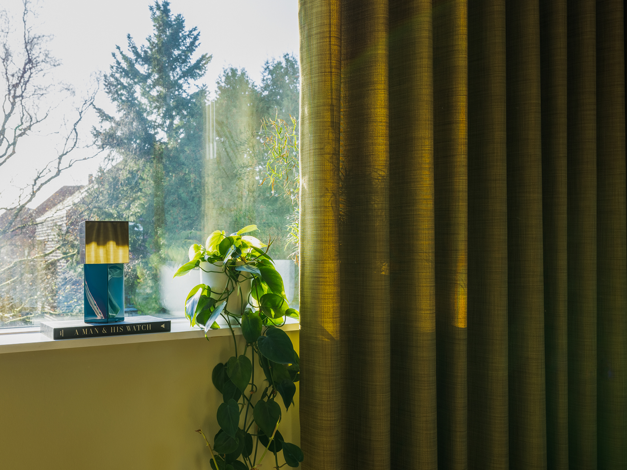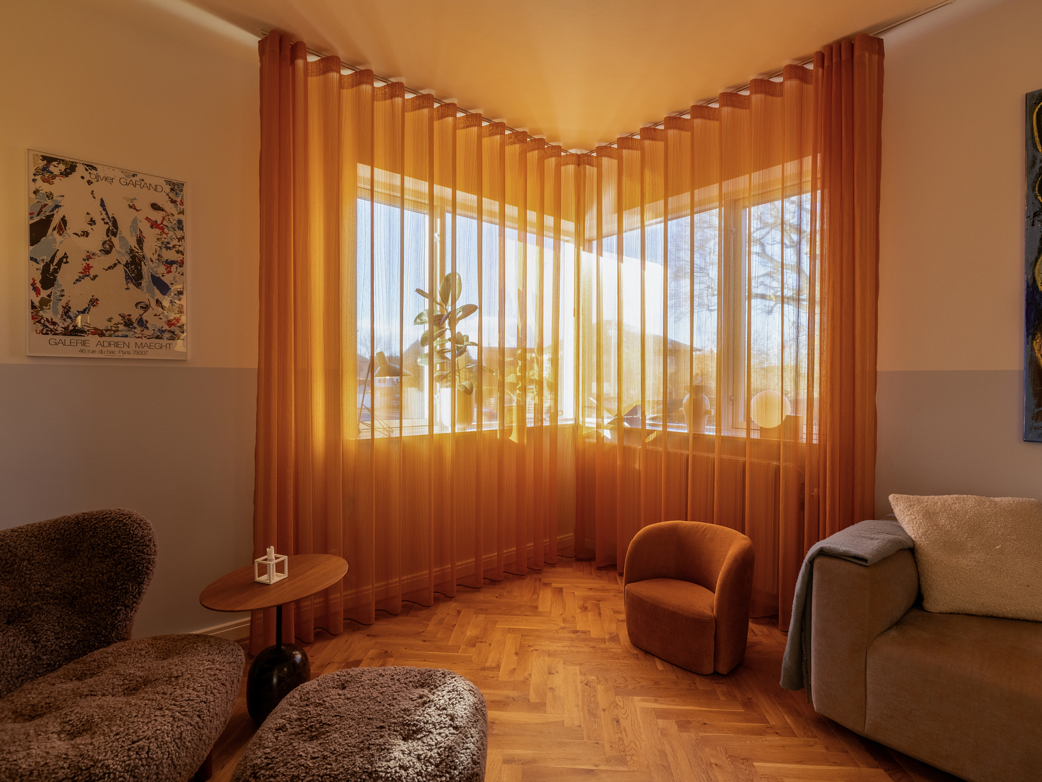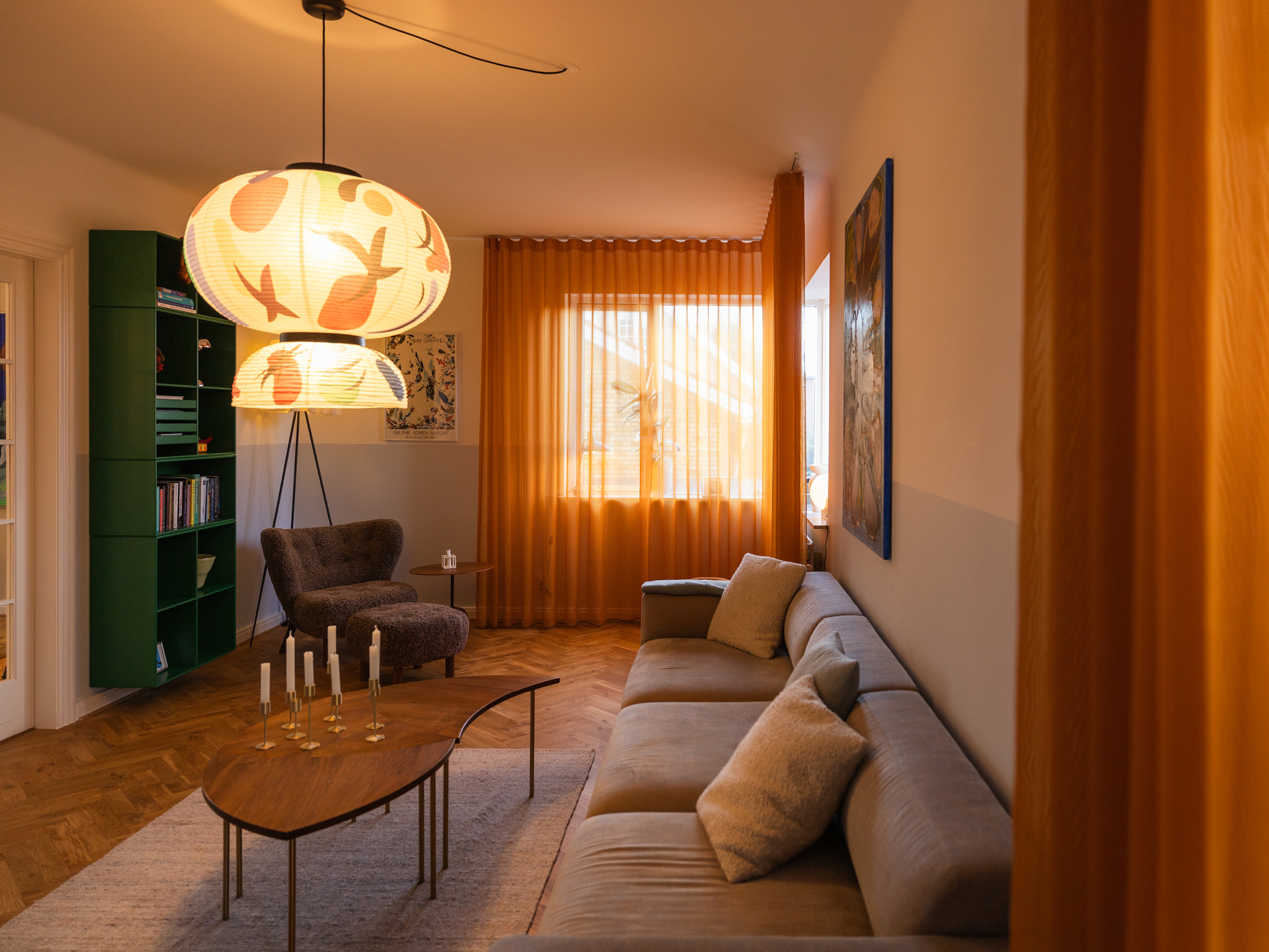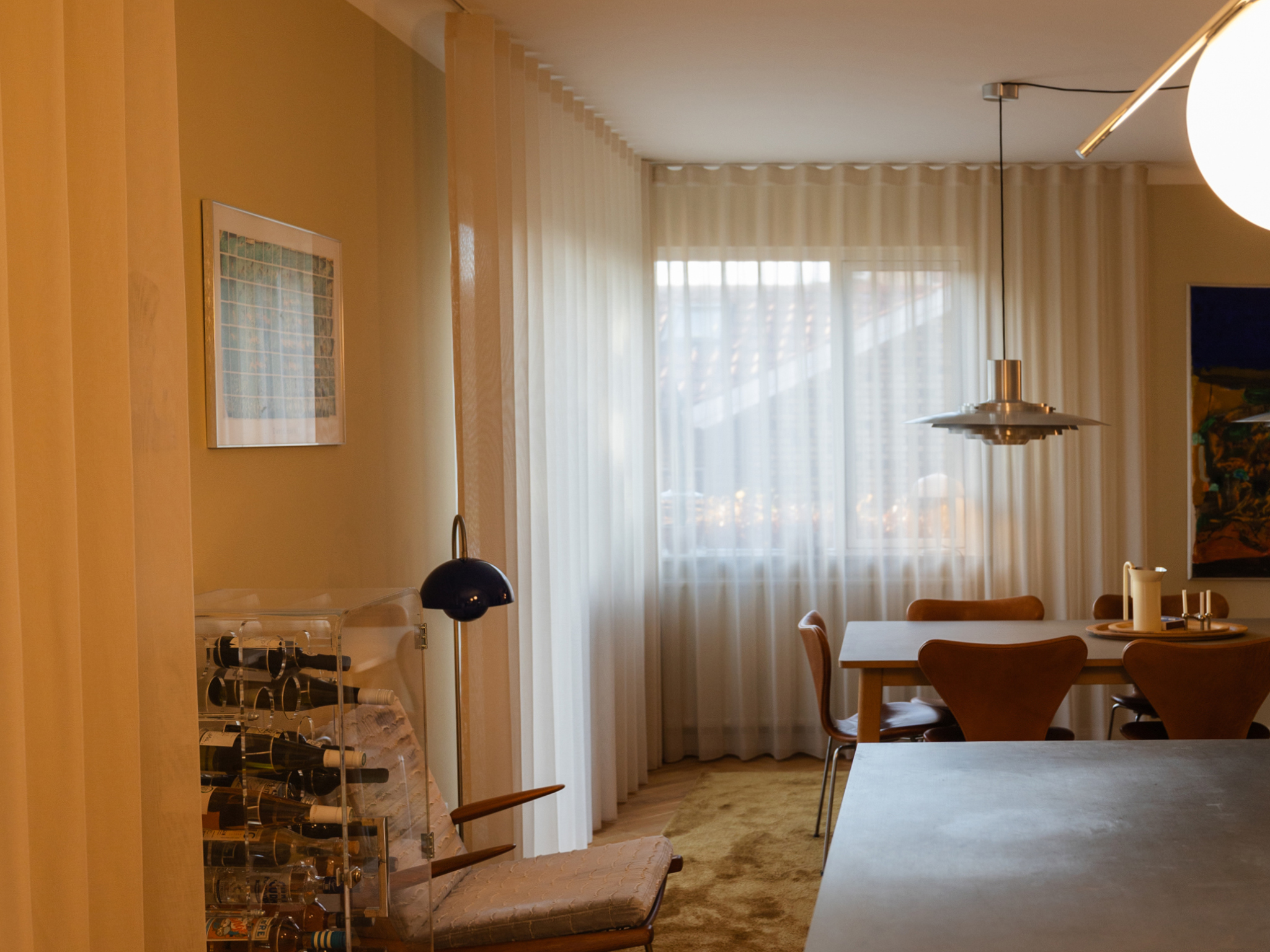 Boligstylist Emma Kousgaard Johannessen bor med klassiske designmøbler, lamper og tekstiler. Hjemmets bløde stofgardiner får farverne frem i lyset.