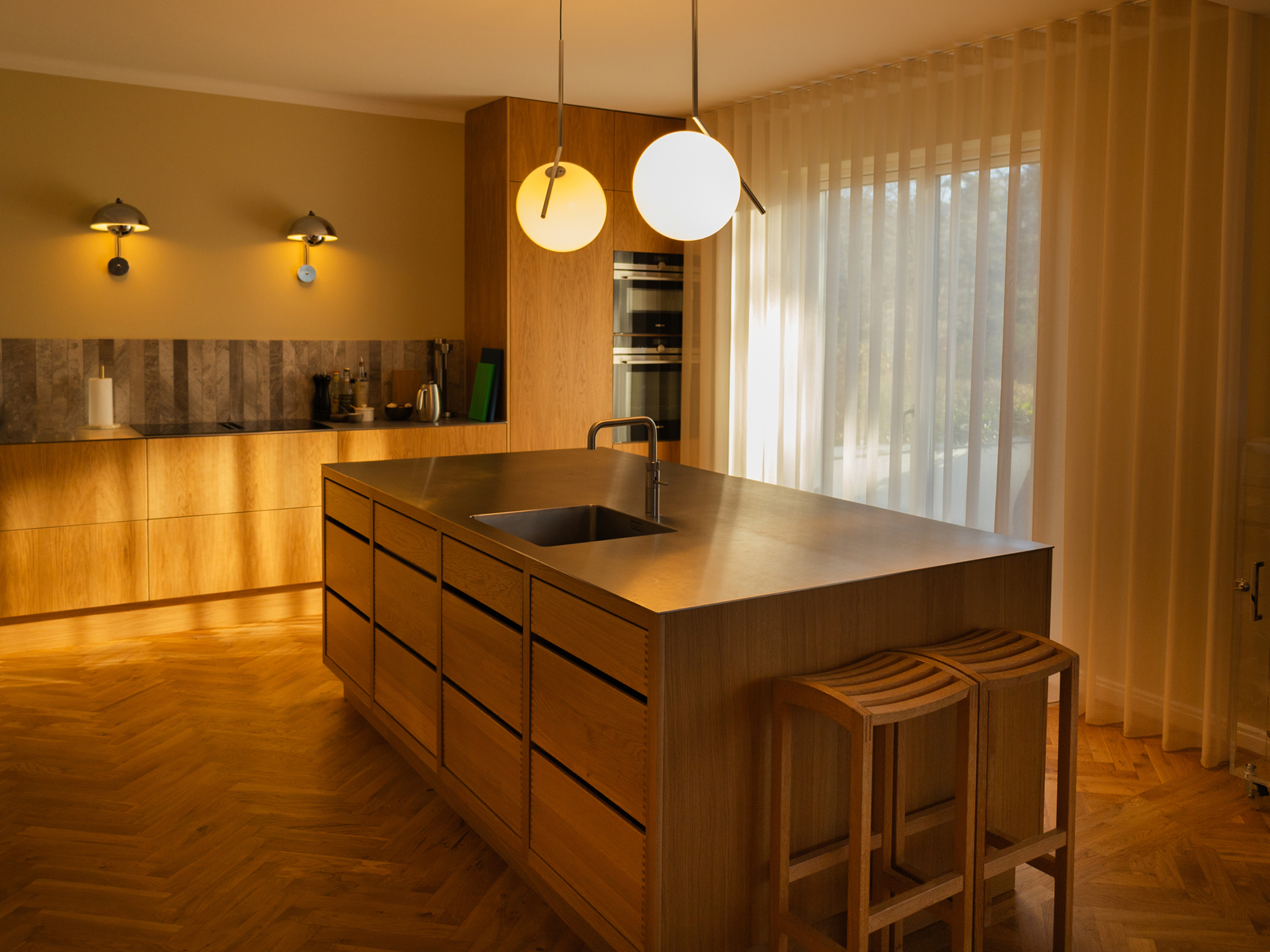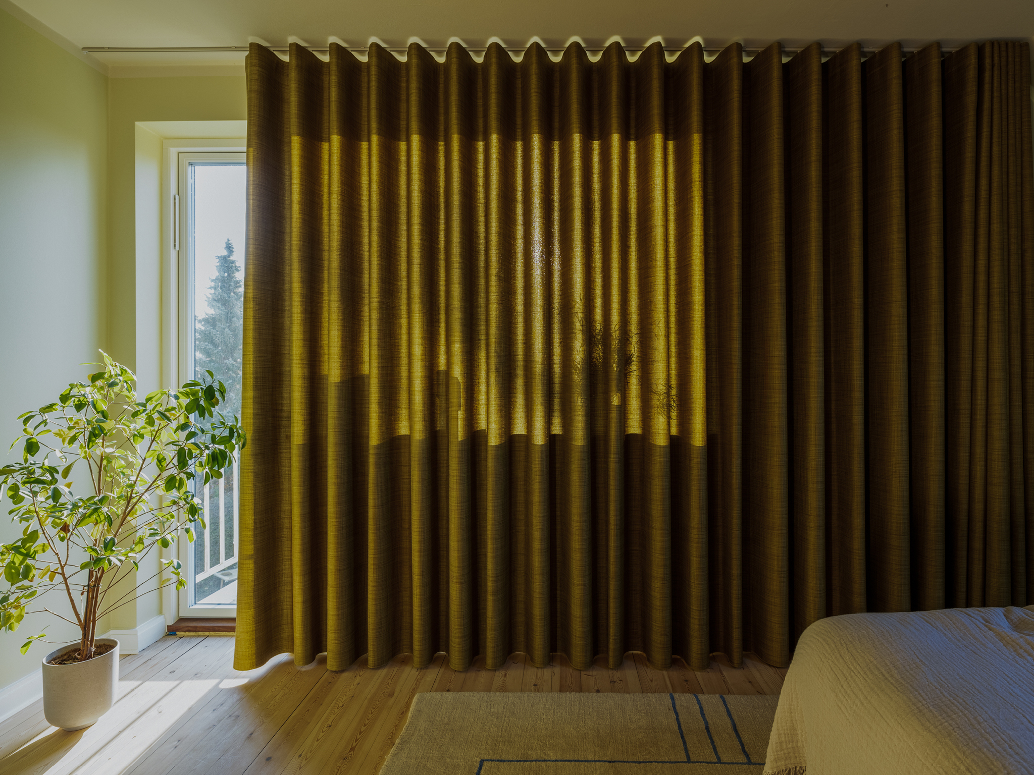 Gardiner kan både lukke lyset ind og fungere som det samlende element i en bolig. Hjemme hos stylist Emma Kousgaard Johannessen er stilen præget af klassiske danske designmøbler, tidløse lamper og bløde tekstiler. Gardinerne er semitransparente og valgt i farvetoner, der harmonerer med hvert rums nøje udvalgte interiør. Når solen skinner, opstår der levende skygge- og lysmønstre, der elegant danser hen over materialerne.