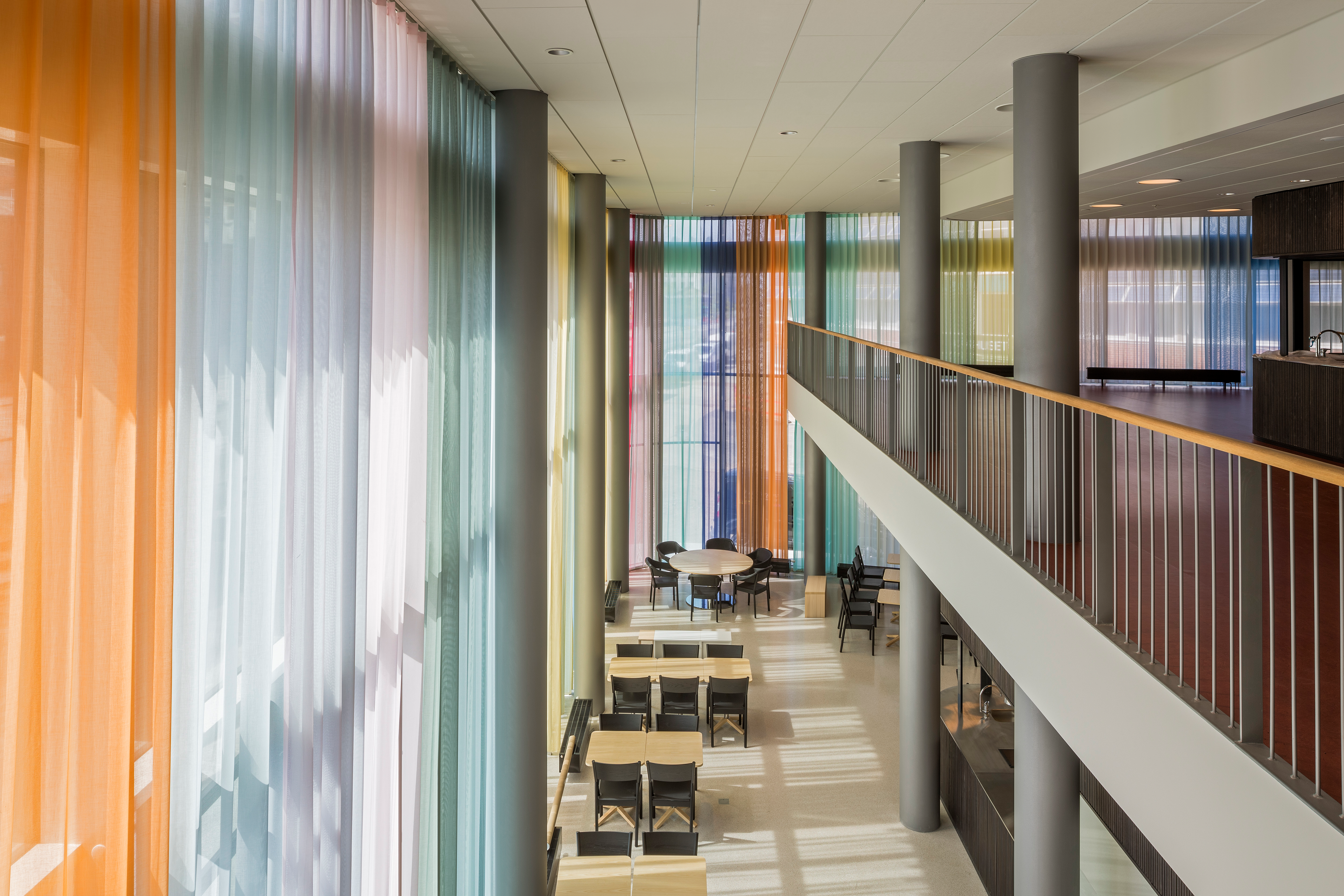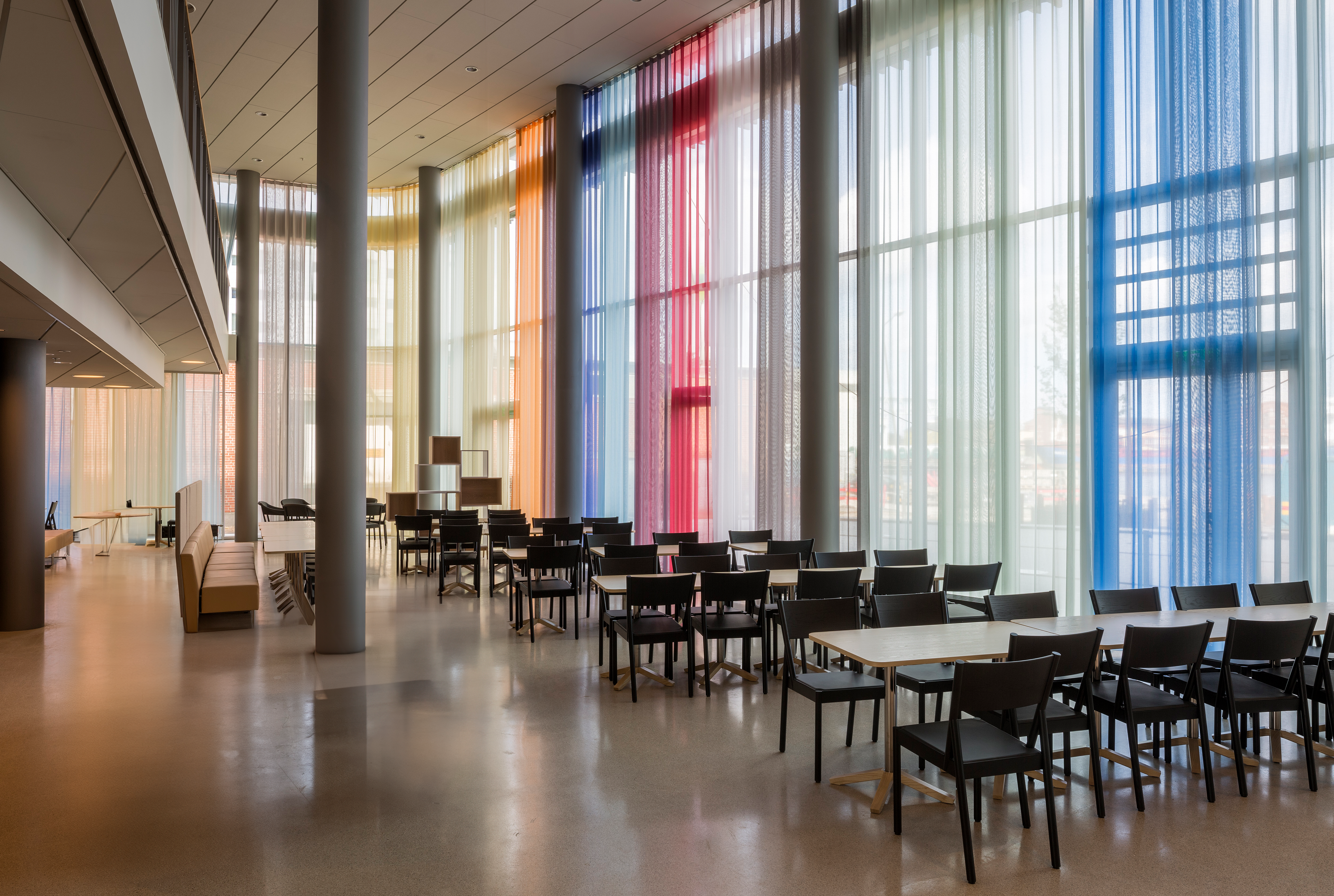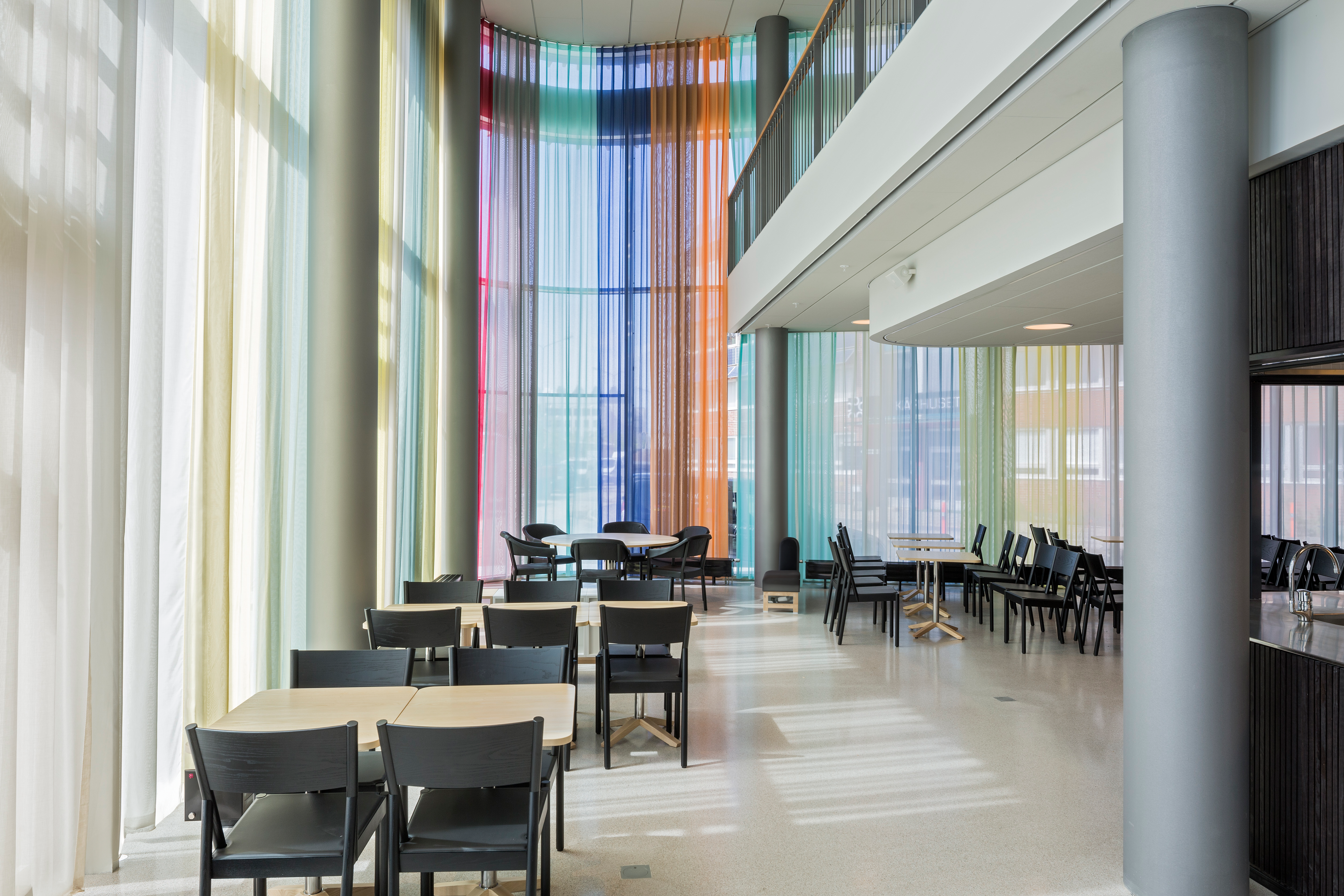 Det integrerede kunstprojekt "Layers of Colours and Light" på Malmø Högskola består af næsten 3 km gardin i op til 8 meters højde. Projektet er designet af Astrid Krogh.