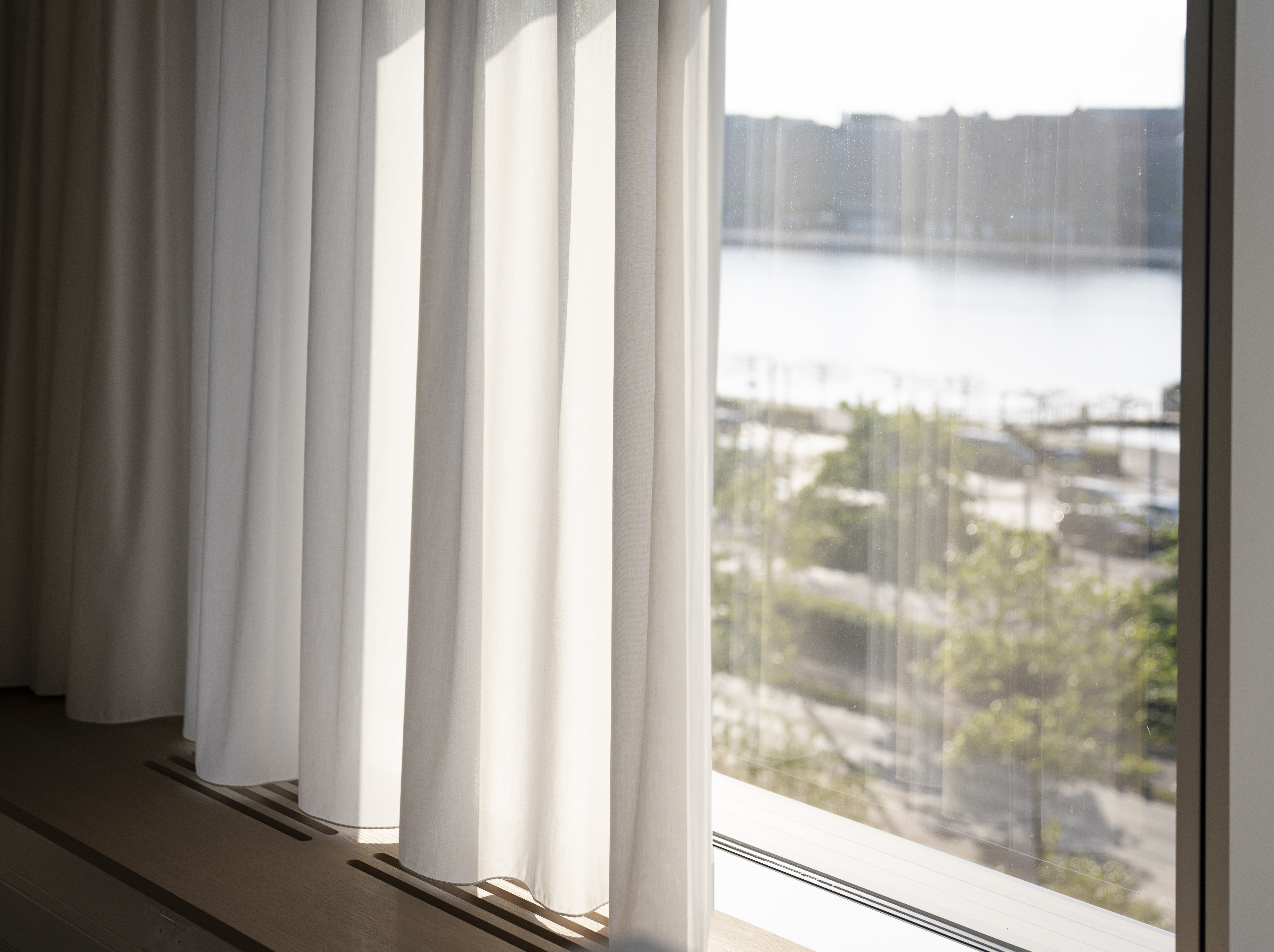 “På den måde tager gardinerne mindst muligt lys, når de står parkeret og giver frit udsyn. Samtidig betyder det også et flot og ensartet udtryk, når man ser facaden udefra.“