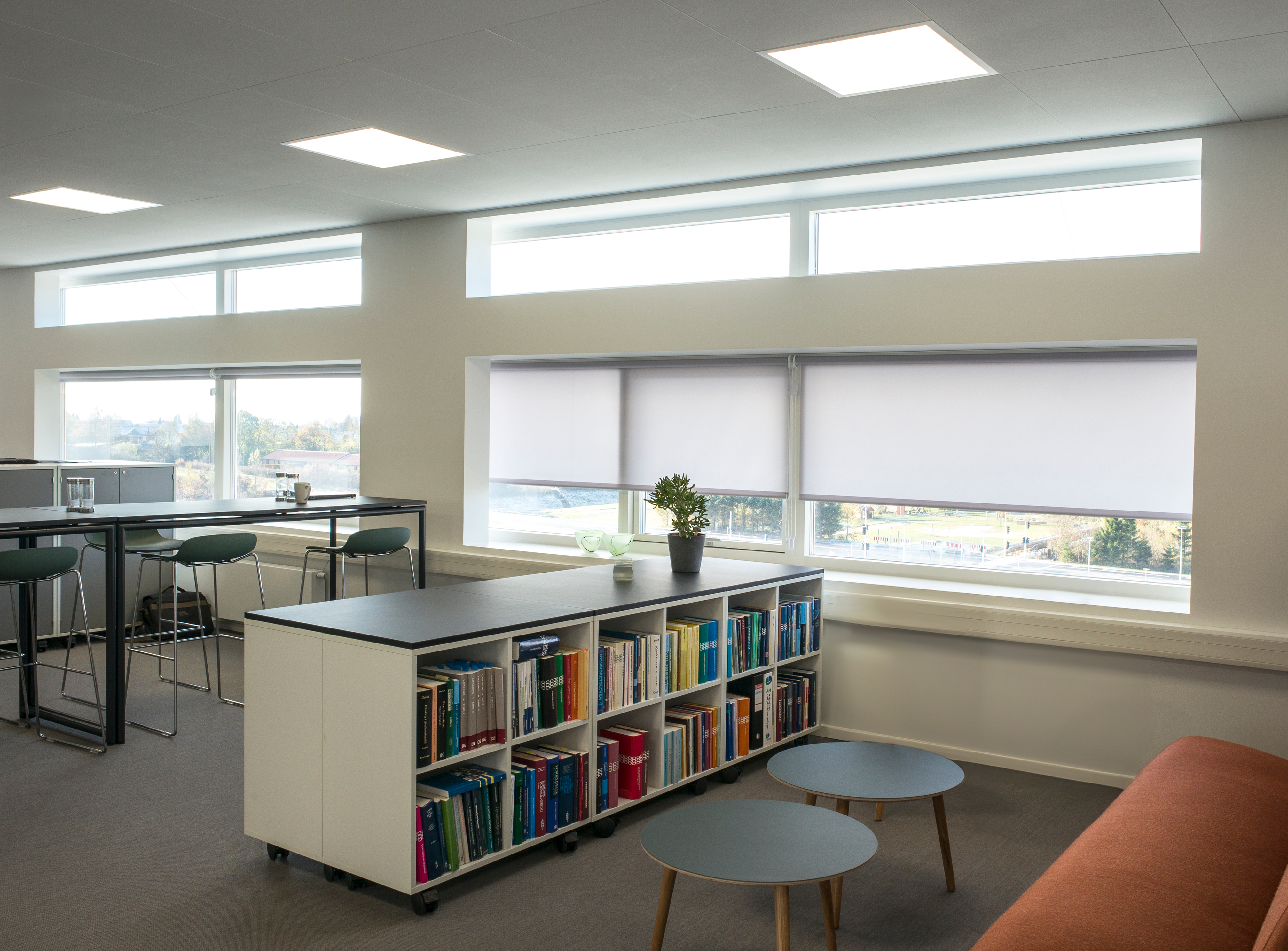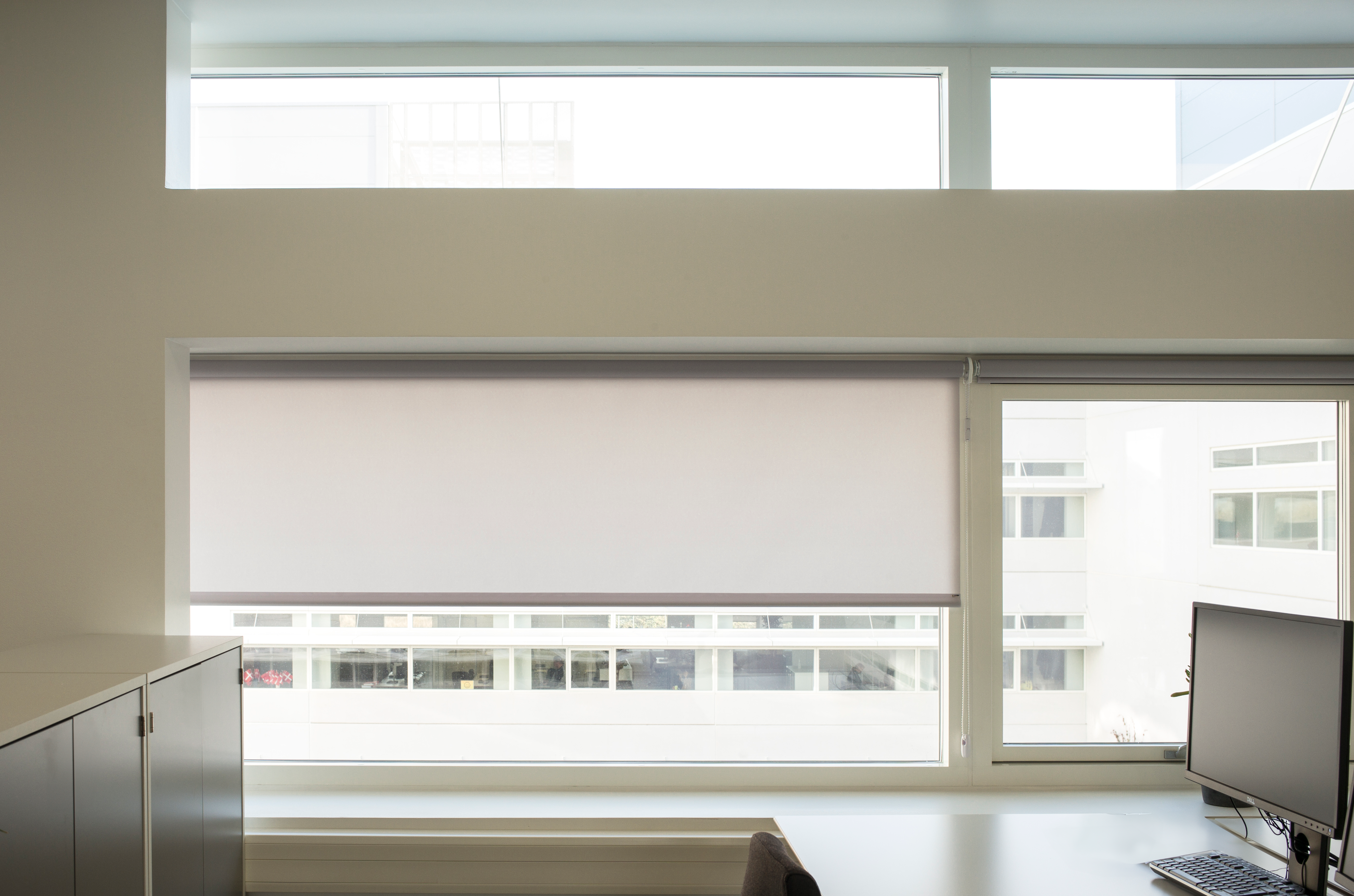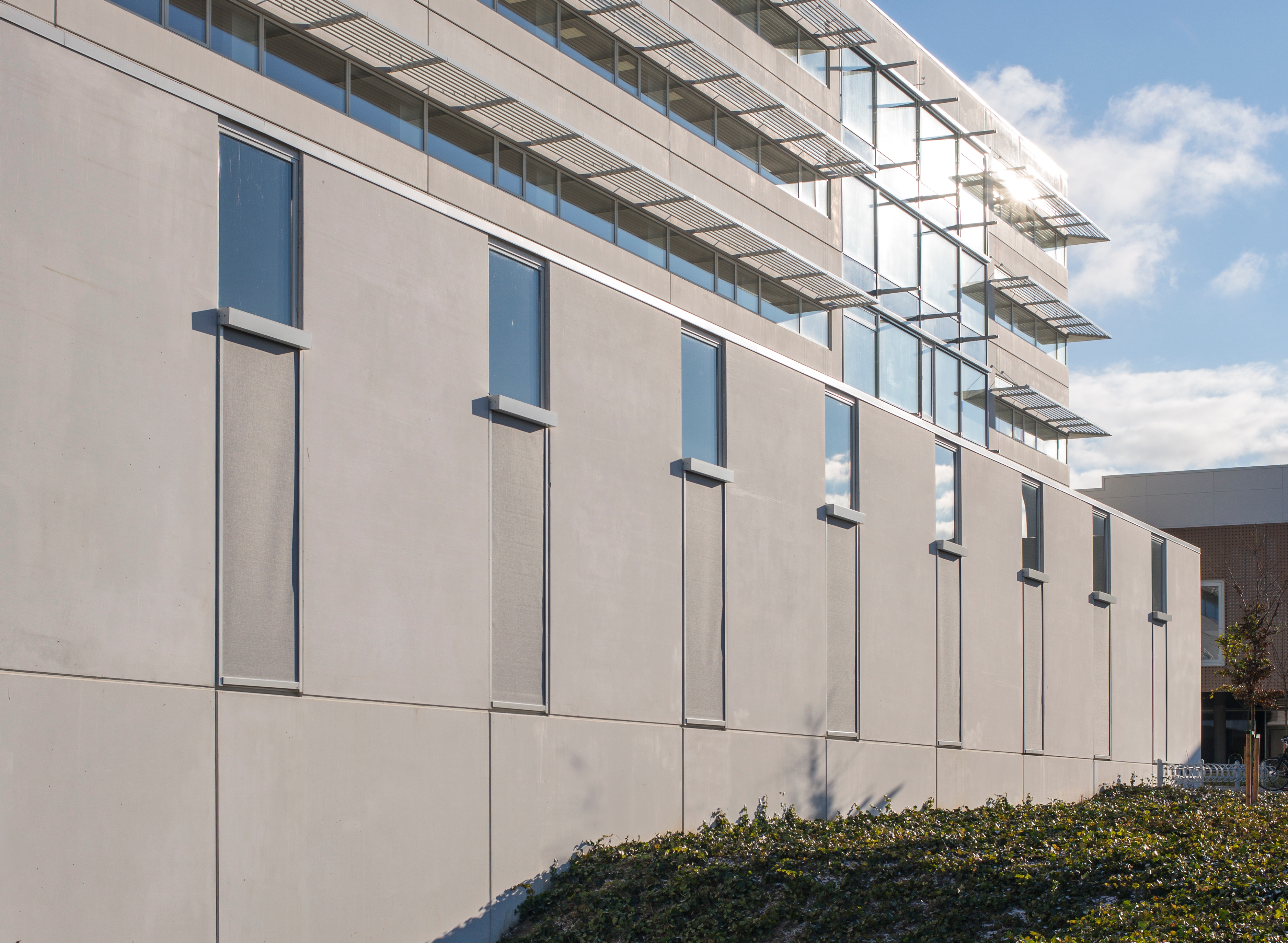 I administrationscenteret har bygherren valgt at montere både indvendig og udvendig solafskærmning i form af screens og rullegardiner. Den udvendige solafskærmning er placeret på de store glasfacader, og rullegardinerne er monteret på alle kontorernes små vinduer.
