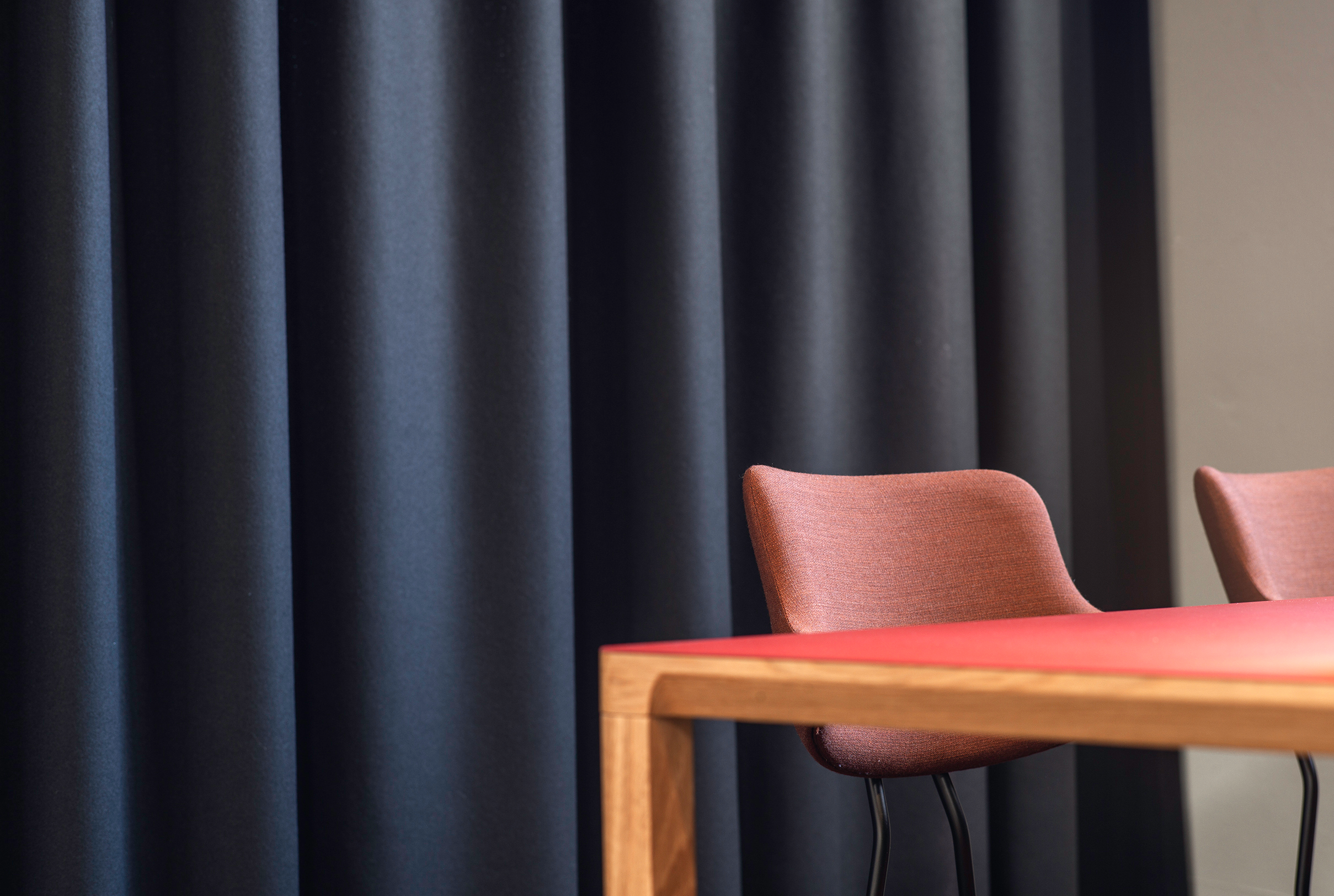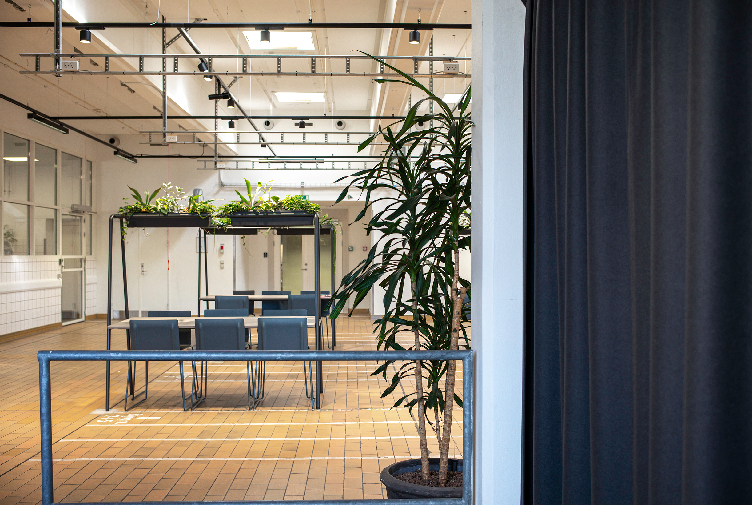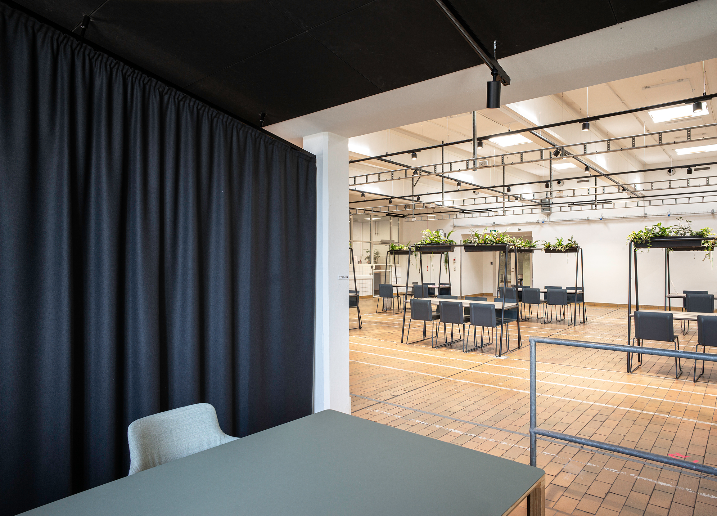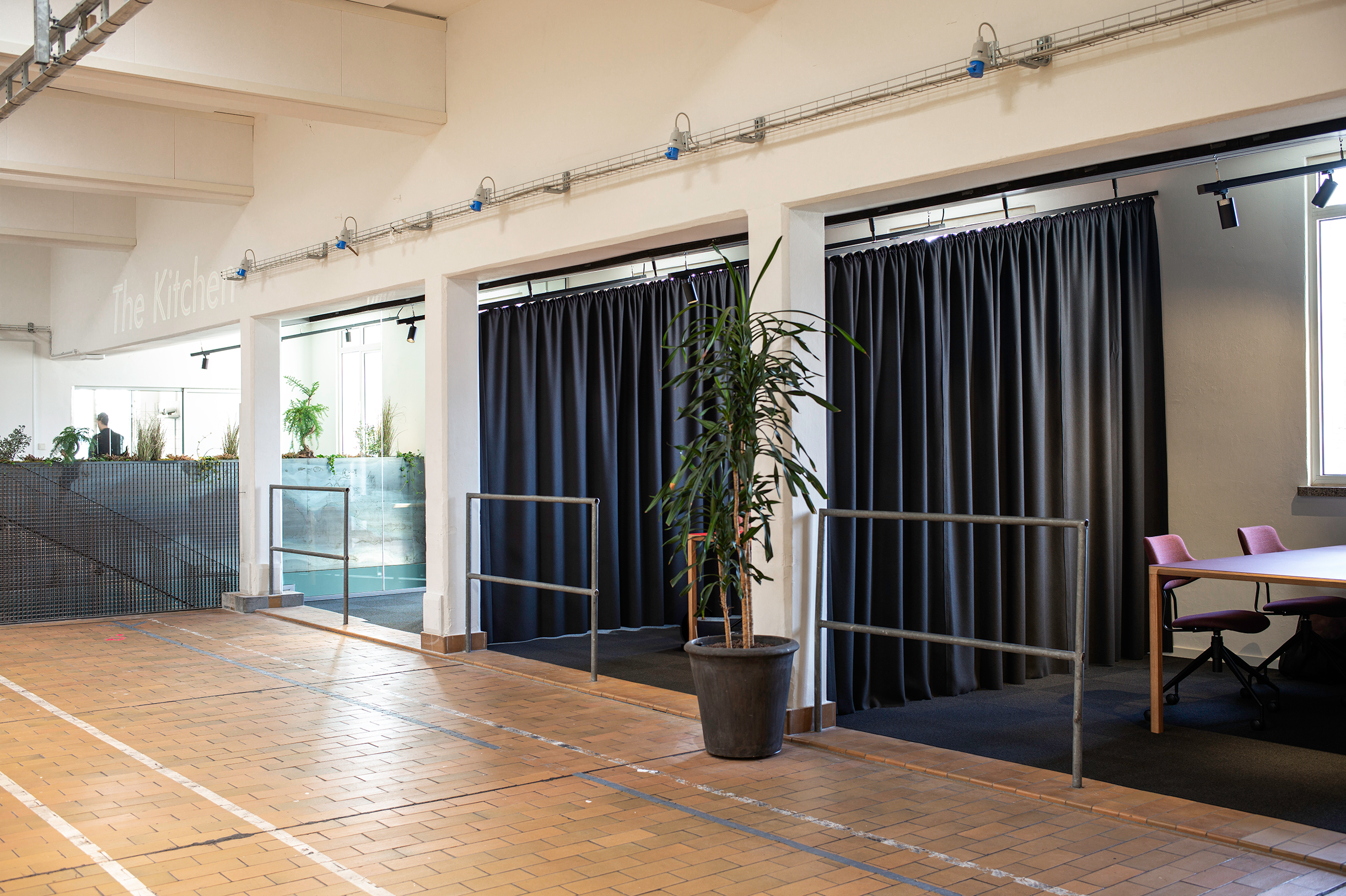 Gardiner, der dæmper støj og skaber små kontorrum. Fischers løsning til The Kitchen, Aarhus Universitets nye iværksættermiljø, havde akustikken og klimabevidste valg i fokus fra start.