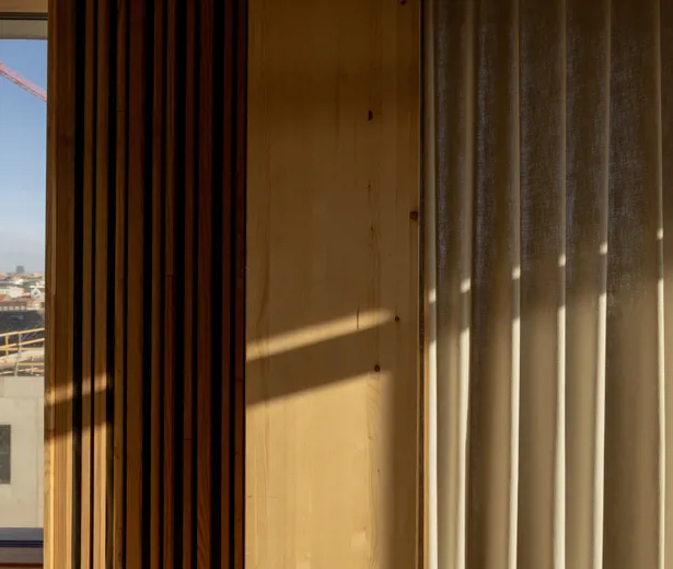 Automatiserede rullegardiner og genanvendt gardinstof bidrager til det gode indeklima i Danmarks højeste træhus.