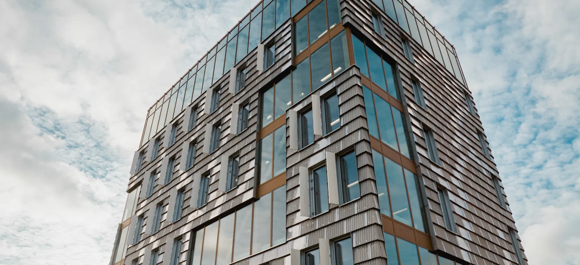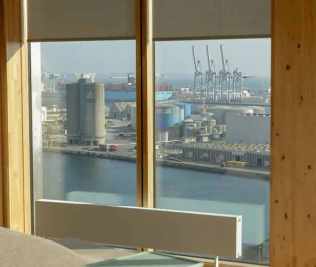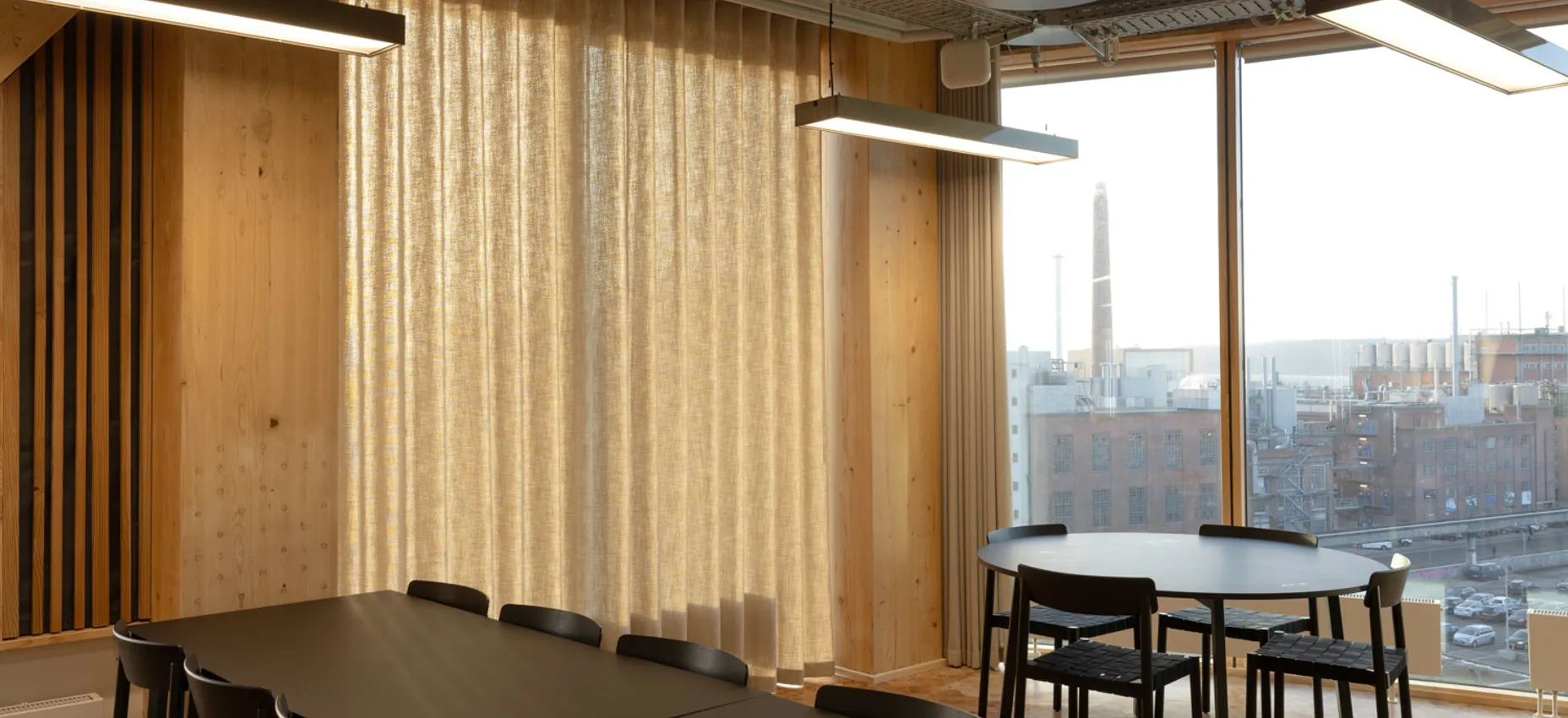 På Sydhavnen i Aarhus står TRÆ. Et imponerende træhus, der med sine 78 meter og 20 etager kan krone sig som Danmarks højeste. TRÆ er skabt til at rumme både mennesker og miljø og udgør et kontorfællesskab med plads til mange forskellige typer virksomheder. Mange etager, mange behov, og da den indvendige solafskærmning skulle udtænkes, kontaktede Kilden & Hindby os hos Fischer. Især to faktorer kom til at spille en væsentlig rolle for valget af solafskærmning. ”Lysindfaldet var vigtigt. Vi fandt et tekstil med en passende transparens, som åbner op for dagslyset og samtidig blænder af, så man kan se, hvad der sker på computerskærmene.