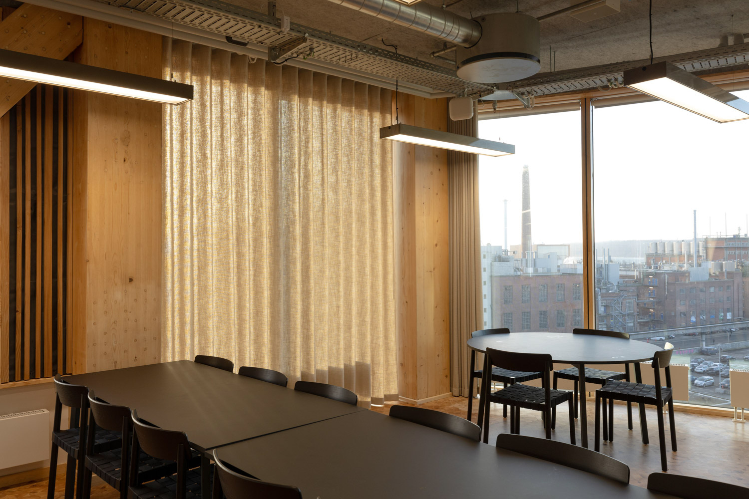 Fischer har desuden leveret bløde stofgardiner til TRÆs kantine, som dagligt bestyres af operatøren Martin Ib, samt til husets fælles mødelokaler.