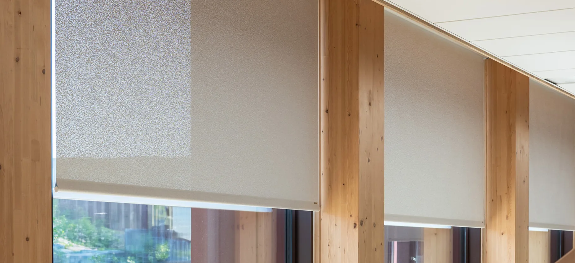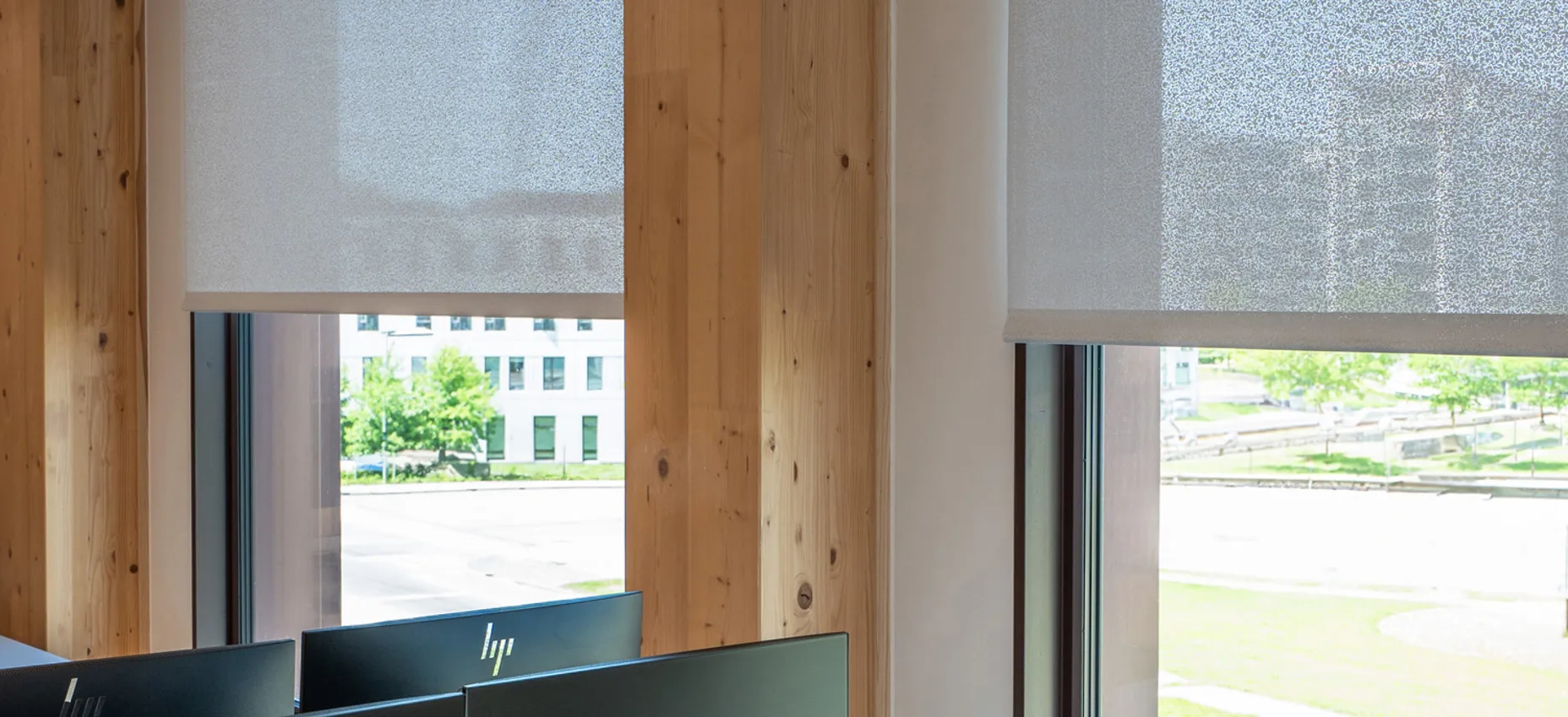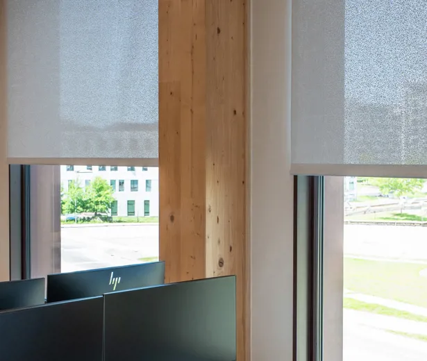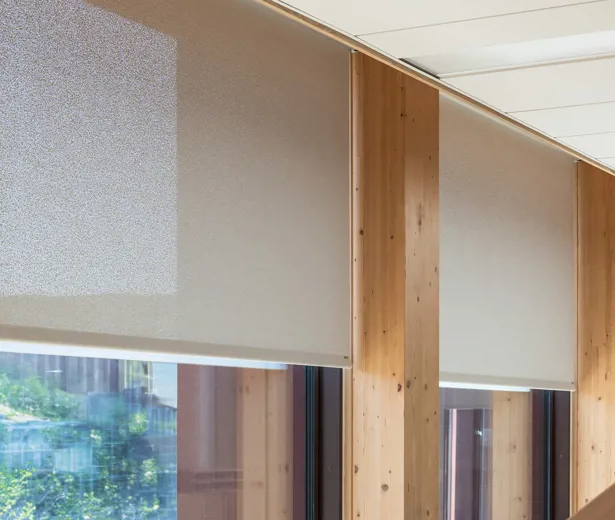 “Rullegardinerne skulle først og fremmest minimere blænding og dernæst varmeindtrængning, så vi fandt et teknisk tekstil med højrefleksiv bagside, der sender solens energi retur. Samtidig skulle løsningen leve op til DGNB-kravene om blændingskontrol og udsyn. Derfor valgte vi et tekstil med struktur, som dæmper lyset uden at lukke verden ude,“