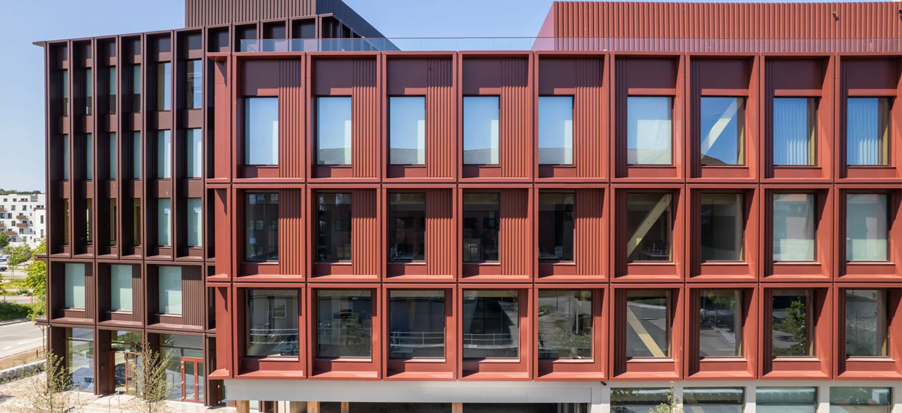 Den nyopførte kontorbygning, WoodHub, har fremtrædende vinduesrammer, der fungerer som integrerede skyggegivere. Dog ikke i et omfang, som opfyldte bygningens ambitiøse indeklimamål. Derfor trådte vi i Fischer til med rådgivning baseret på G-total-beregninger og efterfølgende montage af automatiserede, indvendige rullegardiner.
