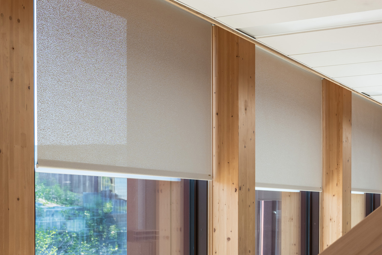 “Rullegardinerne skulle først og fremmest minimere blænding og dernæst varmeindtrængning, så vi fandt et teknisk tekstil med højrefleksiv bagside, der sender solens energi retur. Samtidig skulle løsningen leve op til DGNB-kravene om blændingskontrol og udsyn. Derfor valgte vi et tekstil med struktur, som dæmper lyset uden at lukke verden ude,“