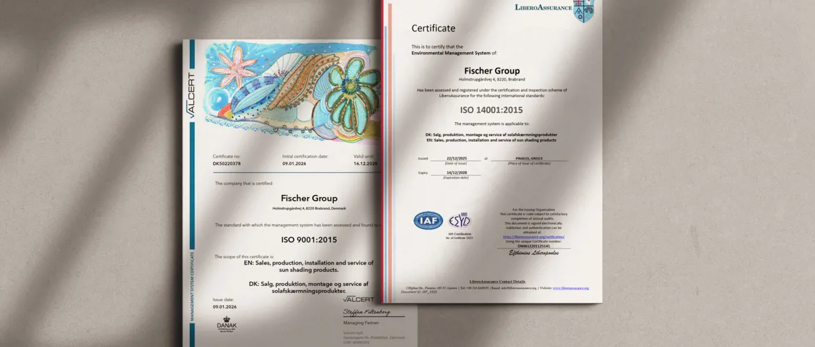 Fischer er blevet certificeret i de internationalt anerkendte standarder ISO 9001 (kvalitet) og ISO 14001 (miljø). Certificeringerne er et vigtigt skridt i vores fortsatte arbejde med at sikre høj kvalitet, ansvarlig drift og gennemsigtighed i hele værdikæden.