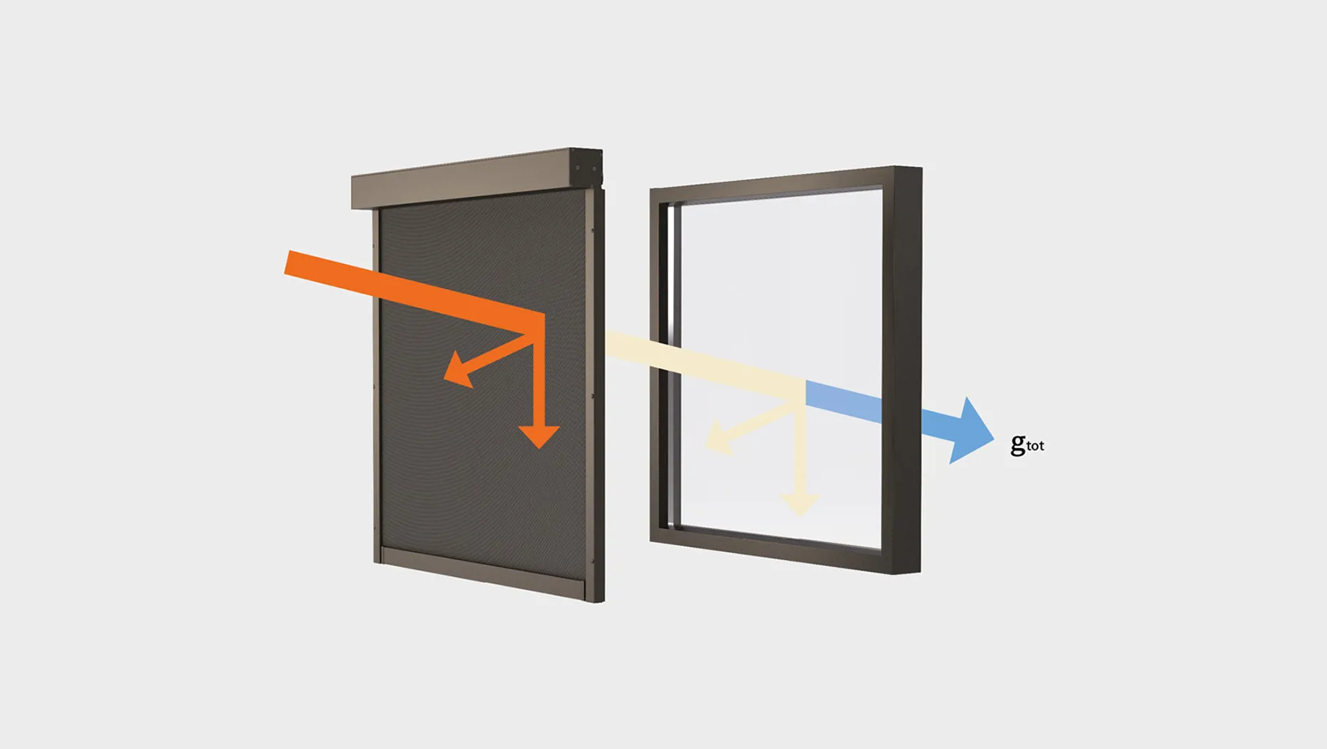 gtot viser, hvor stor en del af solenergien, der trænger ind gennem både ruden og solafskærmningen tilsammen. Den afhænger af tre egenskaber ved materialet: