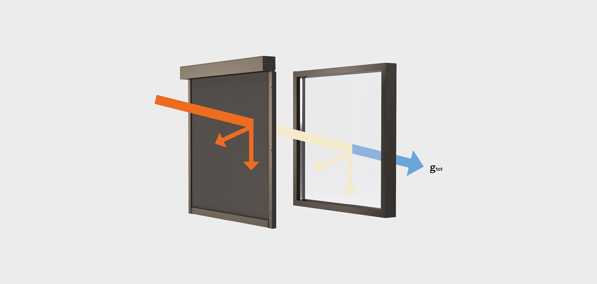 gtot viser, hvor stor en del af solenergien, der trænger ind gennem både ruden og solafskærmningen tilsammen. Den afhænger af tre egenskaber ved materialet: